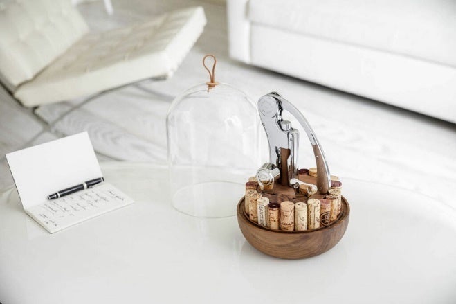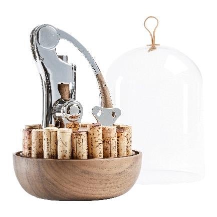 1926年に創業したフランス最大のワインツールメーカーが作る、ワインオープナー・シャンパンオープナー・フォイル(キャップシール)カッターのセット。ガラスケースは職人がひとつひとつ吹きガラスで作りあげ、トップには牛革を使用した高級感あふれるツールセット。周りには最大22個のコルクをコレクションができ、キッチンやテーブルに置いてもおしゃれな雰囲気に。