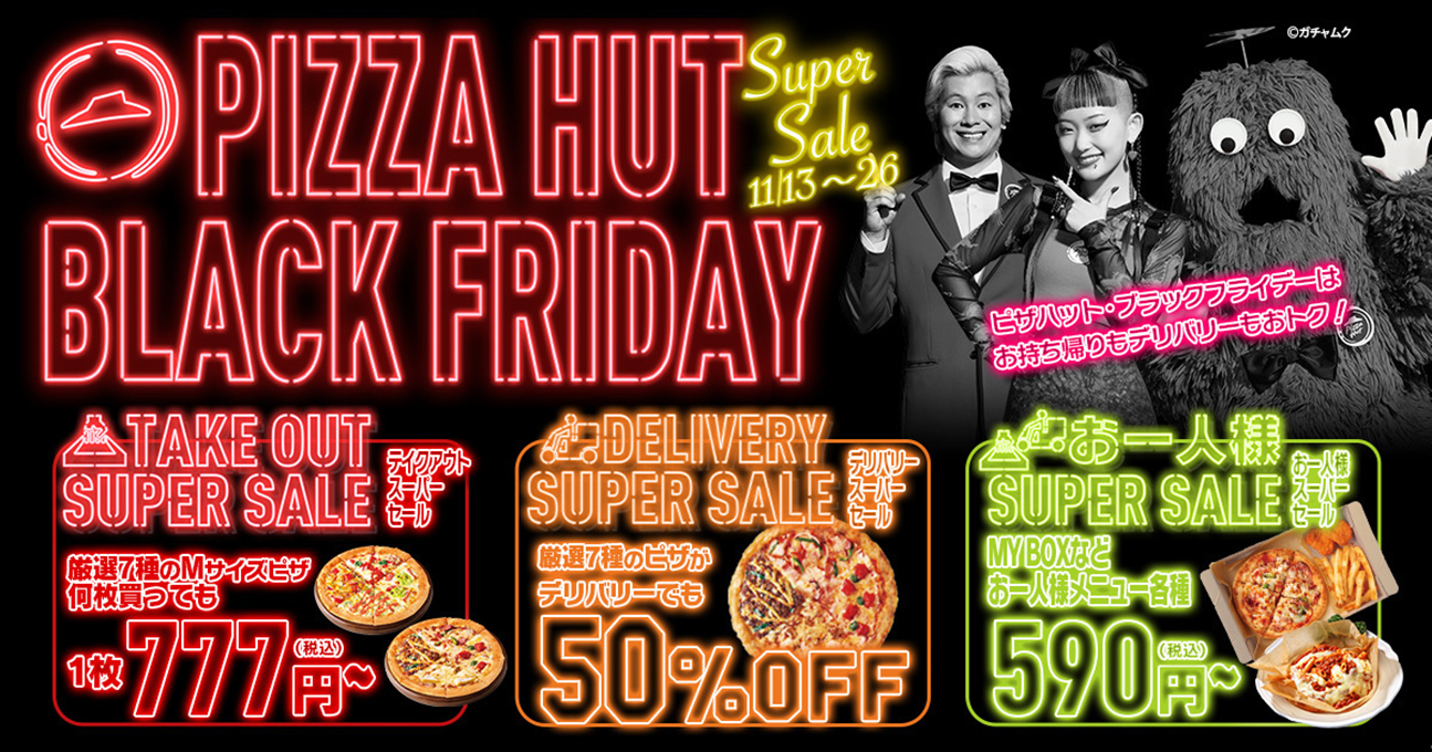 ピザハットは、今年の11月24日(金)のブラックフライデーに備えて、ピザハットを想像以上におトクに楽しめる「ピザハット・ブラックフライデー」として、3つのスーパーセールをご用意しました!