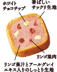 ・リンゴ果汁とアールグレイエキス入りのしっとり生地に、リンゴ果肉とホワイトチョコチップを練り込み、香ばしいサックリ生地と合わせ焼き上げた、彩りあざやかなプチタルトをイメージしたクッキー