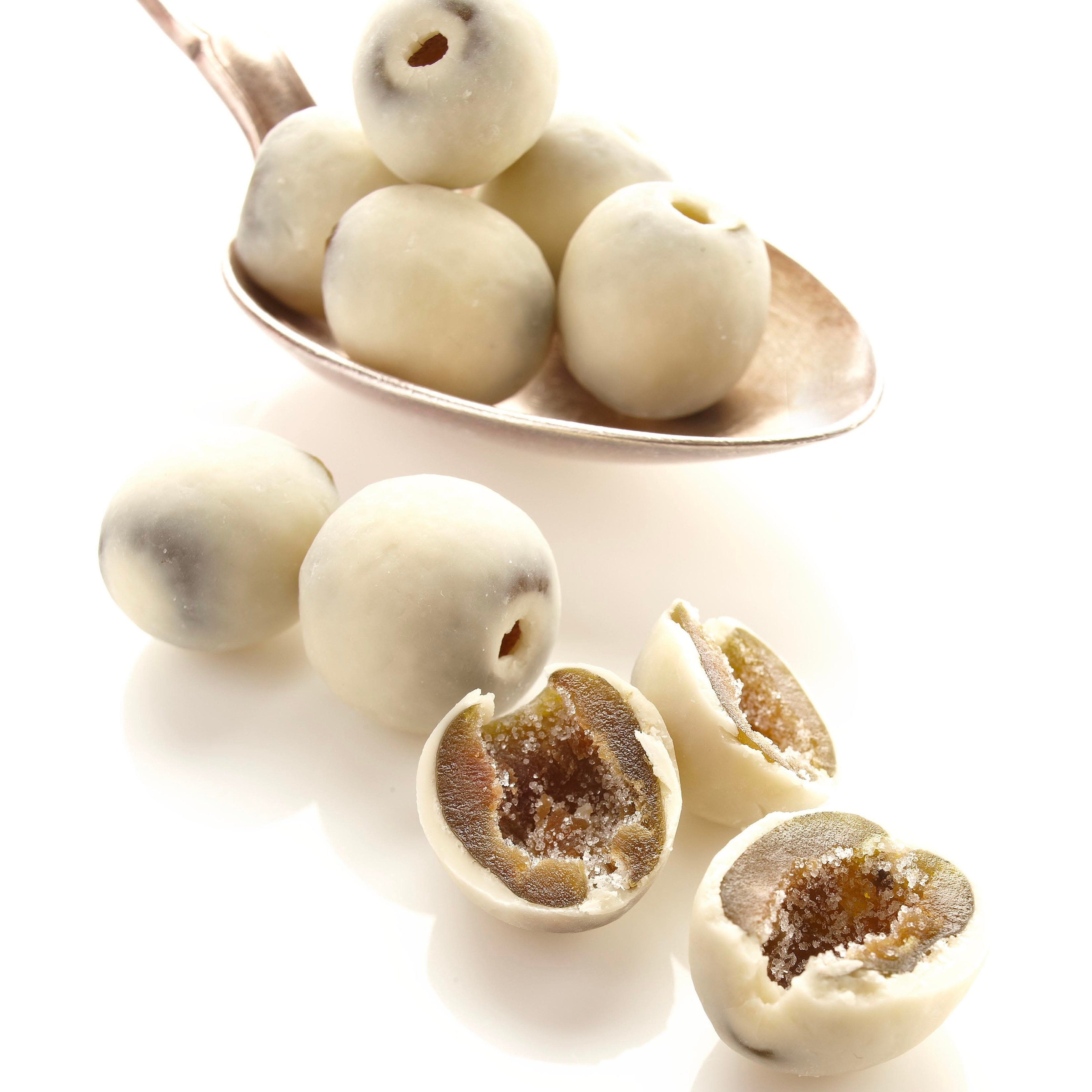 グラッセしたオリーブとホワイトチョコのハーモニー。 じっくりと時間をかけてグラッセしたオリーブをホワイトチョコレートでコーティング。果実のようなオリーブとホワイトチョコレートの組み合わせは、シャンパンやワインともよくあいます。