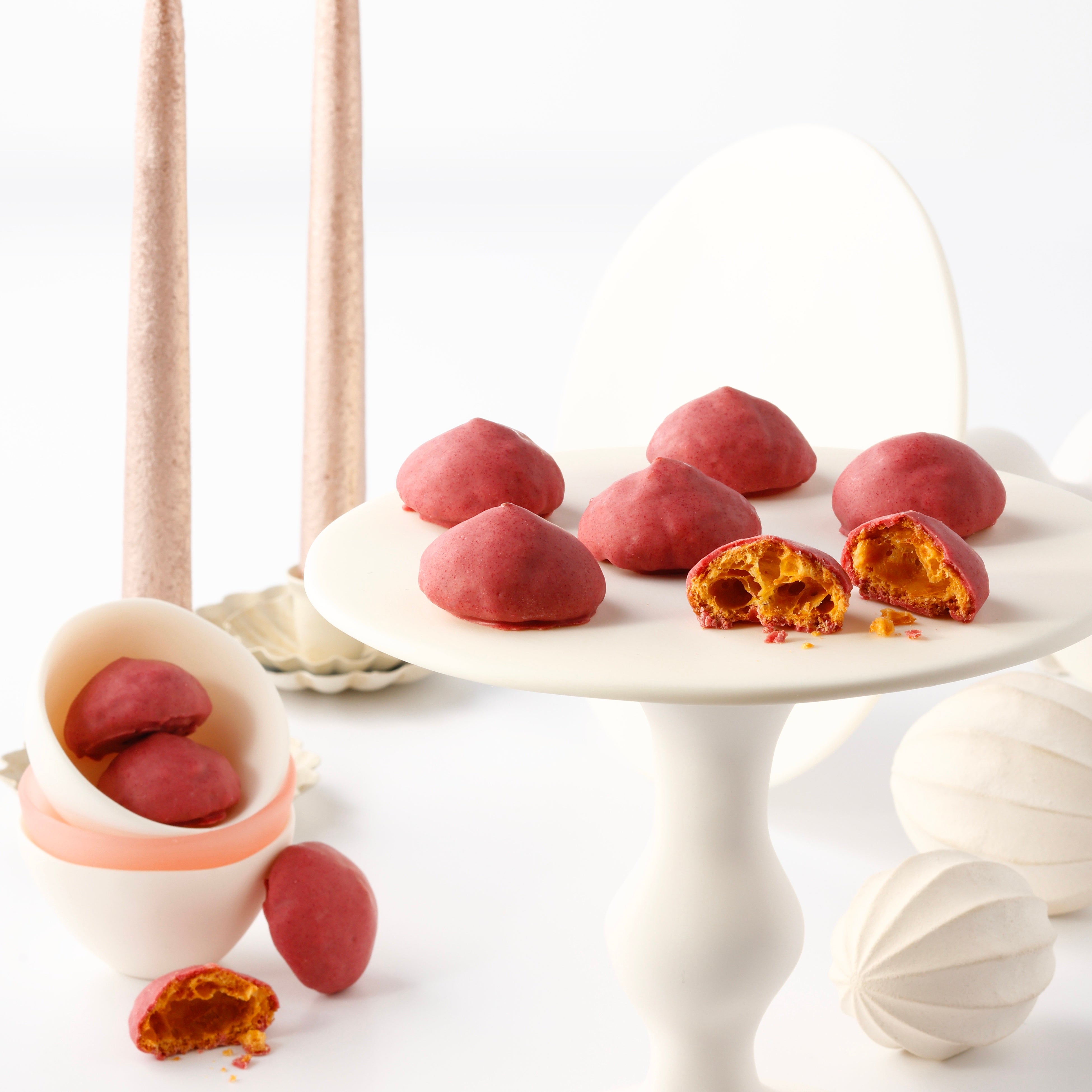 チーズ風味のシュー生地をラズベリーチョコレートでコーティング。ホワイトチョコレートの優しい甘さと、ラズベリーの甘酸っぱさ、シュー生地のチーズ&黒胡椒が豊かな味わいを生み出しています。
