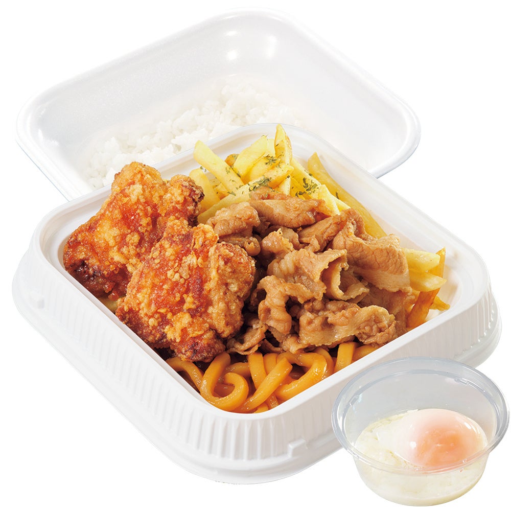 特選醤油からあげ2個、豚肉、うどん、ポテトフライ、生卵、ご飯・みそ汁付き