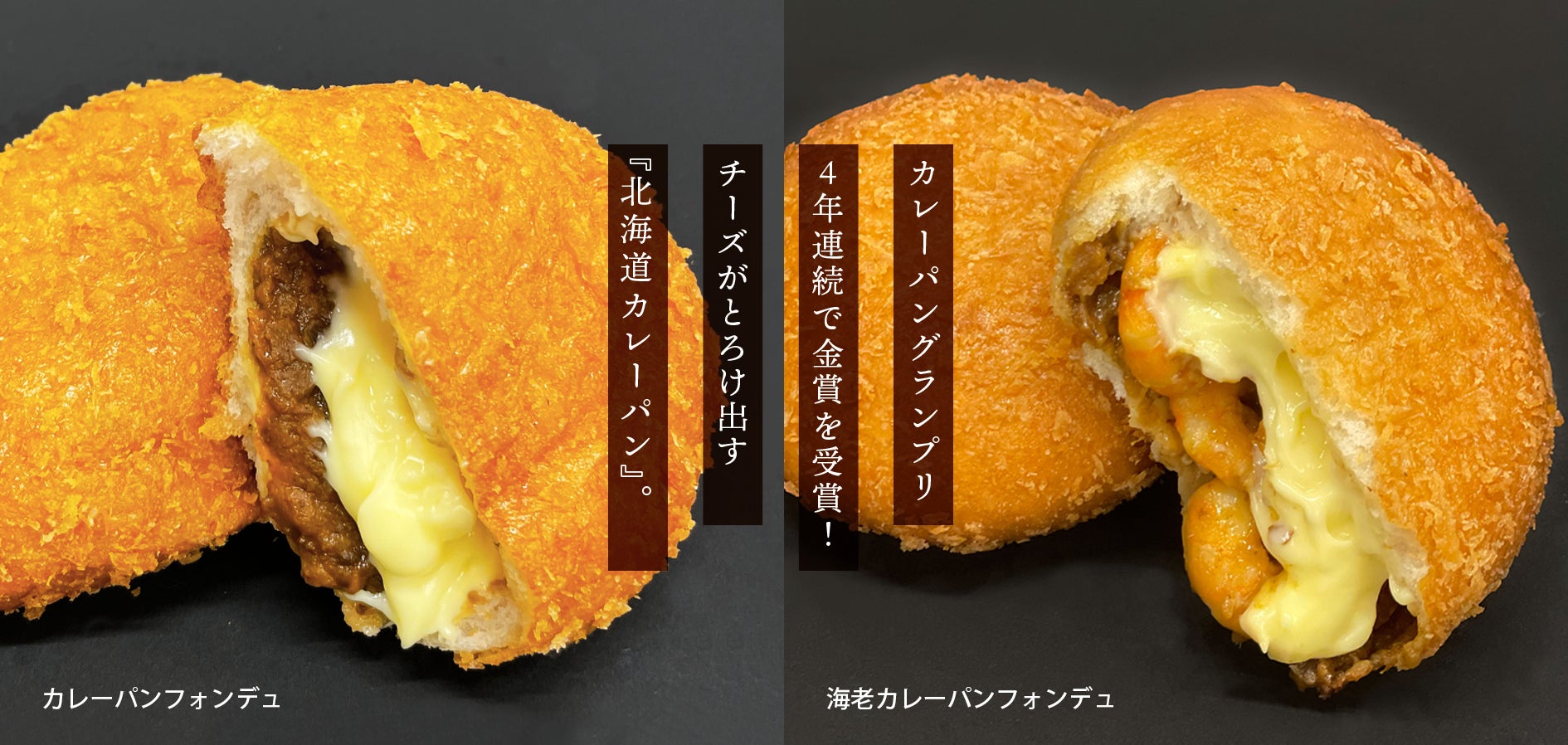 外はカリッ、中はふんわり、もっちり。北海道産小麦「ゆめちから」でつくった、まるでお餅のような弾力の生地に衣をつけてカリッと揚げています。サクサクの衣の中から、特製カレールーとチーズフォンデュがとろけ出す『カレーパンフォンデュ』。カレールーに甘エビのオイルを加え、プリプリの海老が丸ごと入った『海老カレーパンフォンデュ』は、カレーパングランプリで4年連続・金賞を受賞しているペンギンベーカリー自慢のカレーパンです。毎日お店で揚げているので、是非、出来立ての美味しい絶品カレーパンをご賞味下さい。