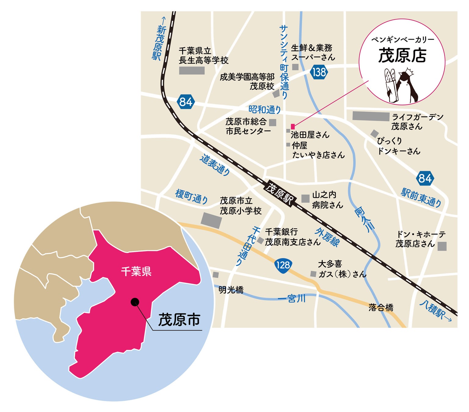新店舗を出店する茂原市は、市街地と自然が共存する千葉県の中核都市。ペンギンベーカリー茂原店は、市民の憩いの場「茂原市民センター」の真向かいにオープンいたします。茂原駅から徒歩約5分と、近隣にお住まいのお客様はもちろん、茂原駅をご利用される市外のお客様にもご利用いただきやすい店舗です。