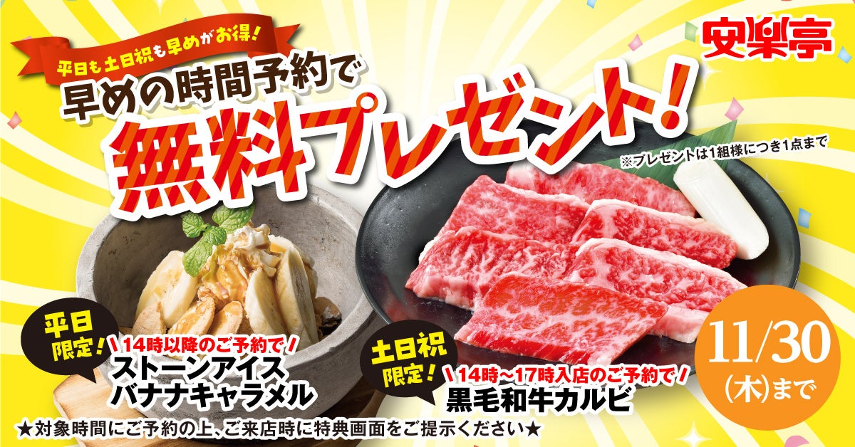 【安楽亭】焼肉パーティー応援キャンペーン&早めの時間ご予約特典