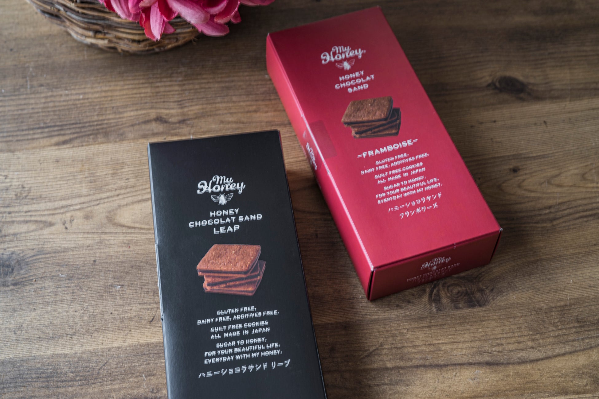 生はちみつの優しい甘さで仕上げたチョコクッキーサンド「ハニーショコラサンド」はひとつひとつ手作り。はちみつとカカオのみで作り上げるチョコレートをたっぷりと使用した、贅沢な一品。今回は、そんな「ハニーショコラサンド リープ」と、濃厚なハニーチョコレートと甘酸っぱいフランボワーズが相性抜群の「ハニーショコラサンド フランボワーズ」をセットにし、ホリデーシーズン限定商品として発売します。*通常販売している「ハニーショコラサンド リープ」「ハニーショコラサンド フランボワーズ」は上記画像の商品となります。