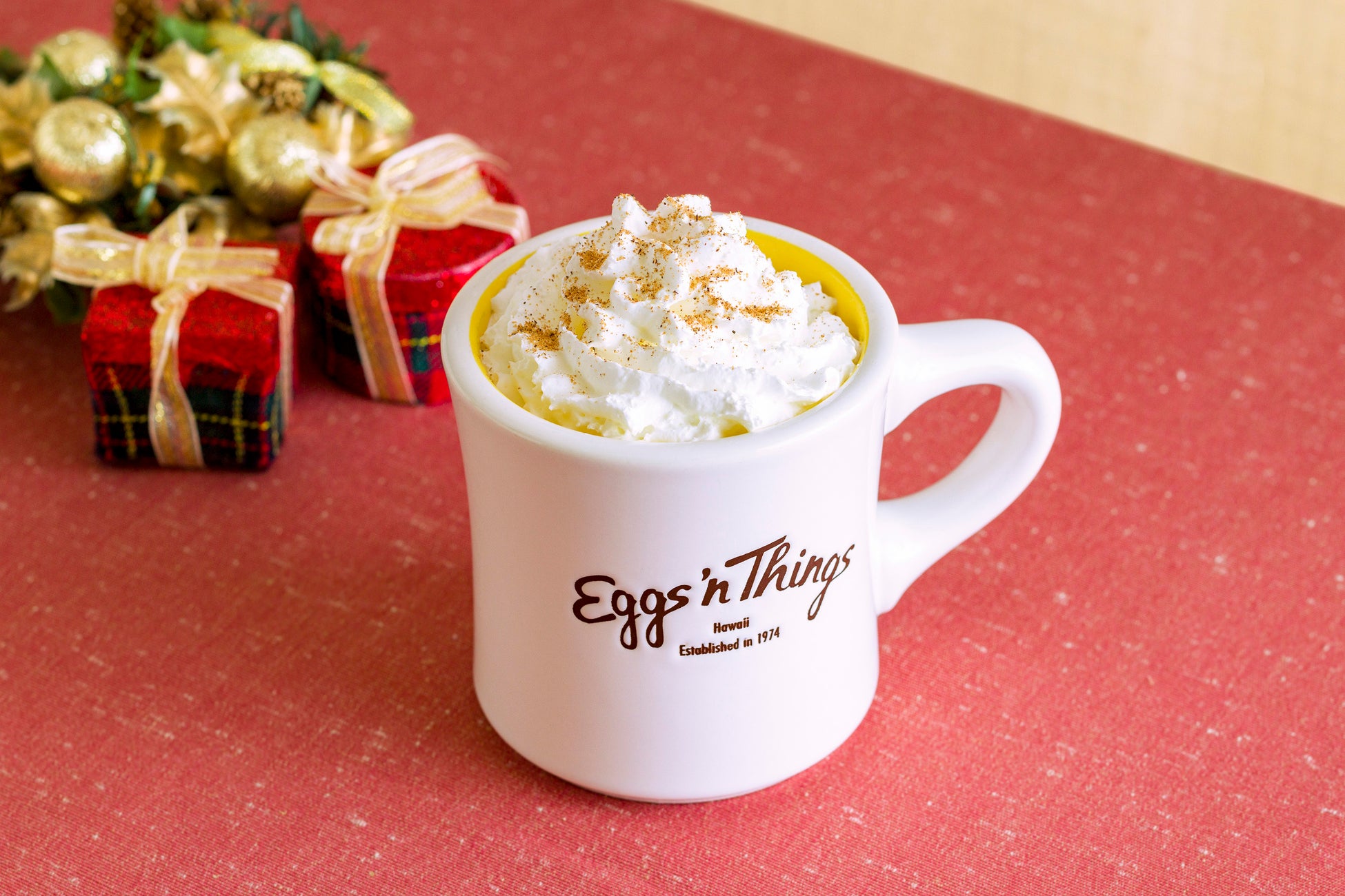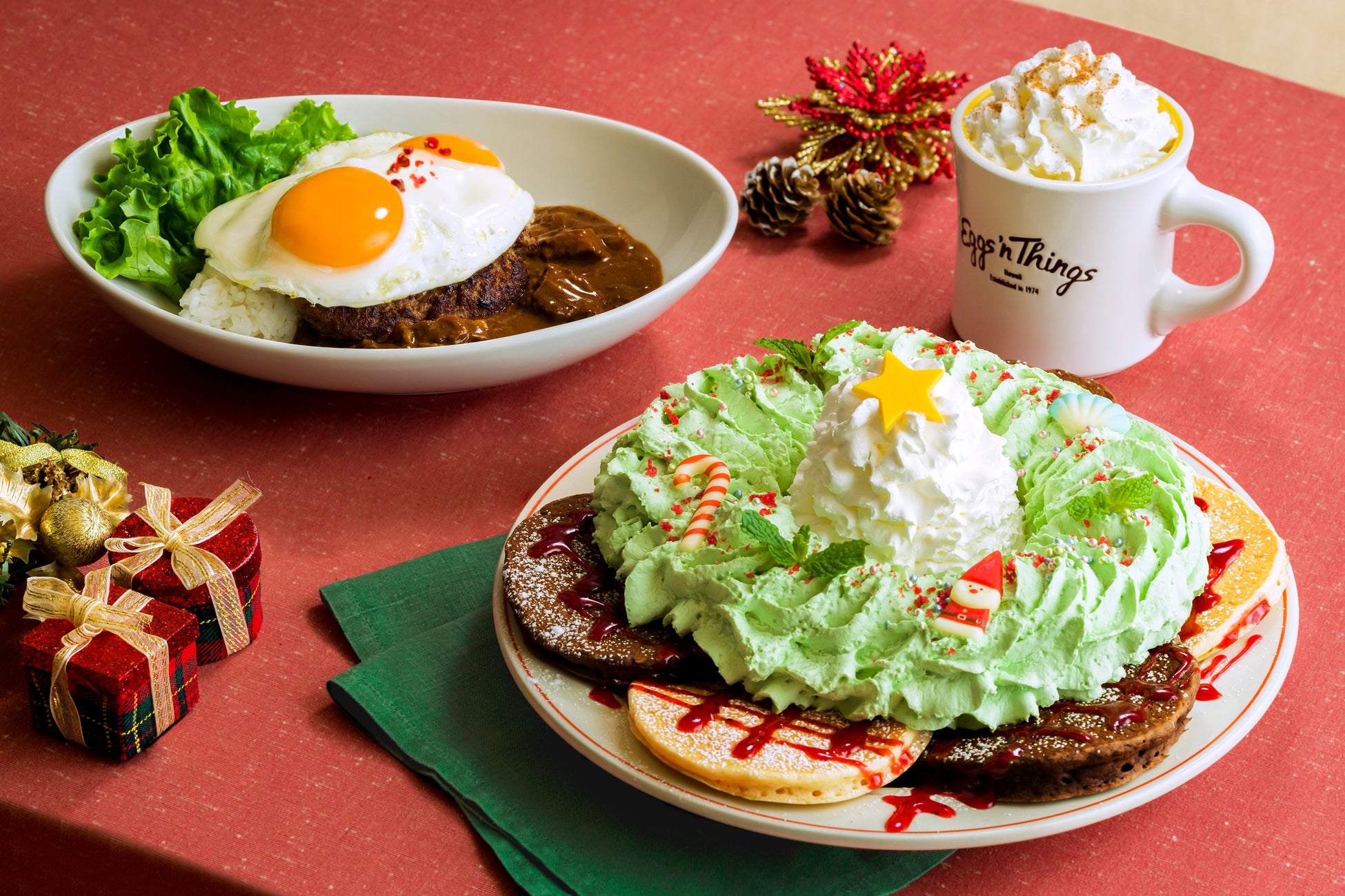 Eggs ’n ThingsおよびEggs ’n Things Coffee全店舗で『クリスマスリースパンケーキ』と『ビーフシチュー ロコ・モコ』を11月25日(土)~12月25日(月)の期間限定で販売いたします。香り高いピスタチオホイップクリームでクリスマスリースに彩られた『クリスマスリースパンケーキ』は、ホイップクリームの中に隠れたホワイトチョコクリームと甘酸っぱいストロベリーソースが良く合う一皿です。オリジナルパンケーキに加えてチョコレートを使った生地で2種類の味をお楽しみいただけます。『ビーフシチュー ロコ・モコ』は、じっくり煮込んだシチューの芳醇な香りにごろっとした牛肉とビーフパティを使ってハワイのロコフードに仕上げました。また、バニラカスタードのような味わいにスパイスが効いたアメリカでクリスマスドリンクとして親しまれている『エッグノッグ(Hot)』もご用意しています。ぜひ、Eggs ‘n Thingsのクリスマス限定メニューでゆっくりとお食事をお楽しみください。