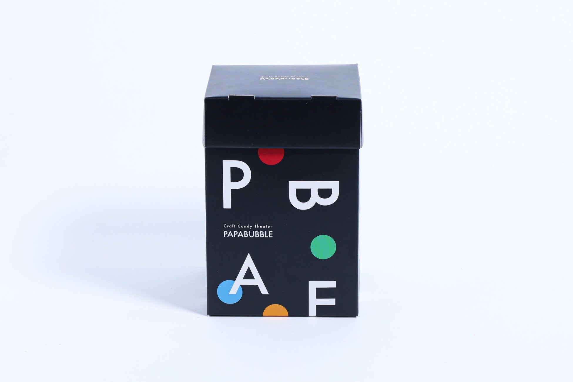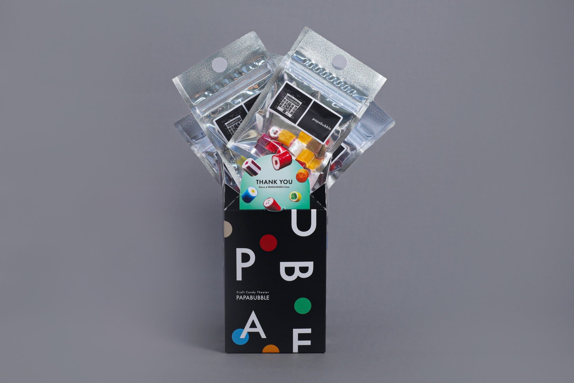 パパブブレの代表商品である『フルーツミックス』や、THANKYOUの文字が入った『サンキューミックス』、季節によって中身が変わる『シーズン限定ミックス』が、それぞれ3袋ずつ入った、お得なプレミアムボックスです。パッケージは、ブランドカラーのブラックに、「PAPABUBBLE」の文字とカラフルなドットを散りばめたグラフィックを採用し、ワクワク感を演出しています。箱を開けると、ポップアップのメッセージが飛び出す仕掛け付きで、パパブブレらしい遊び心も加えた楽しいBOXに仕上げています。