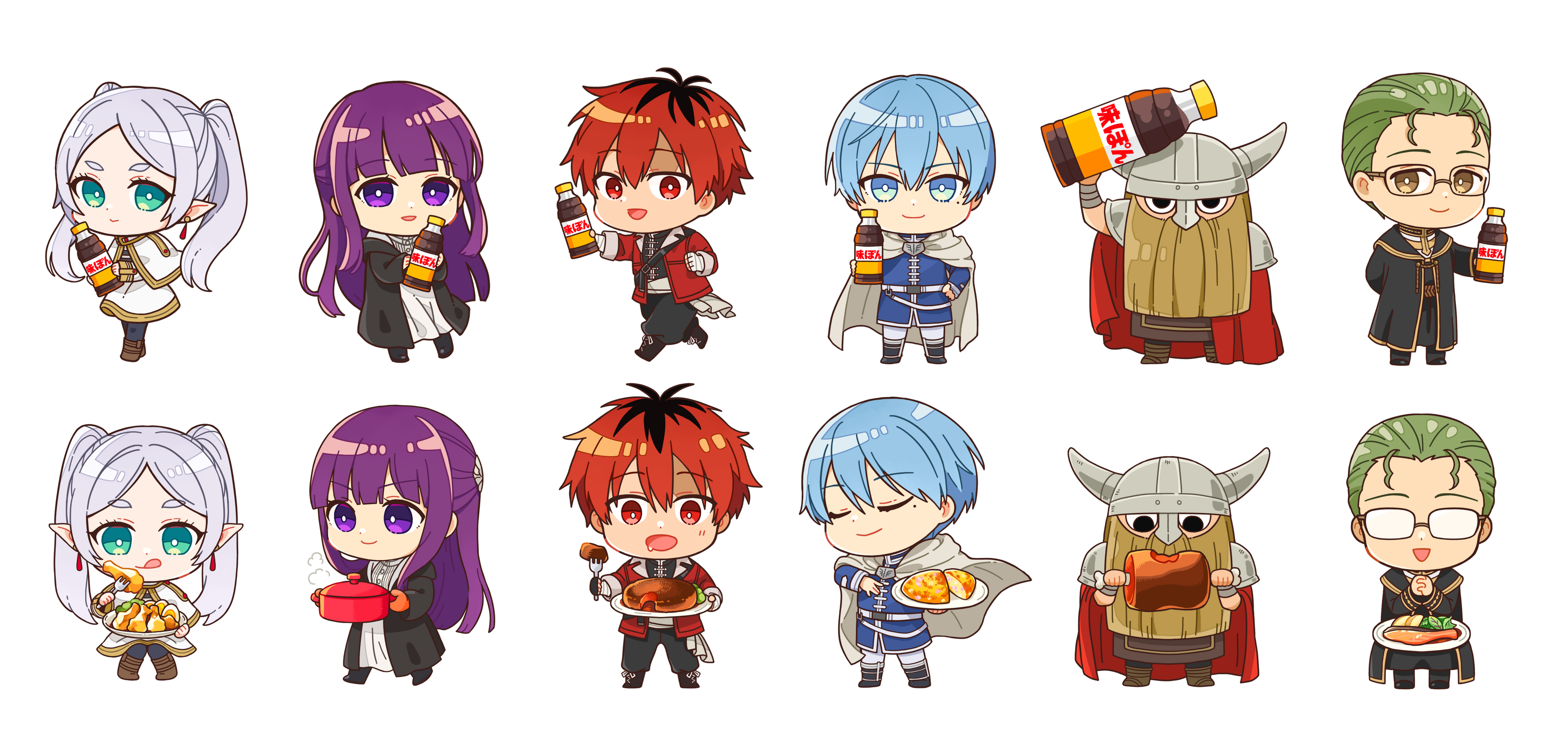 コラボに伴い、主要キャラクターをデフォルメした本コラボオリジナルのミニキャラクターが登場。フリーレン、フェルン、シュタルク、ヒンメル、アイゼン、ハイターの6キャラクターによる「味ぽんを持っている姿」「食事中の姿」の計12種類のポーズを用意しました。