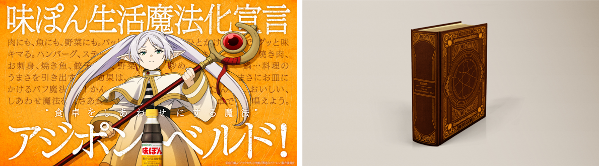 肉や野菜にひとかけするだけで、あっという間に料理が美味しくなる「味ぽん」は、まるで魔法のような調味料であるという気づきから、アニメ本編で旅の中でも役立つさまざまな生活魔法が登場する『葬送のフリーレン』との異色のコラボレーションが実現。「味ぽん」のネーミングが大胆にあしらわれた生活魔法『アジポンベルド(食卓をしあわせにする魔法)』が誕生しました。