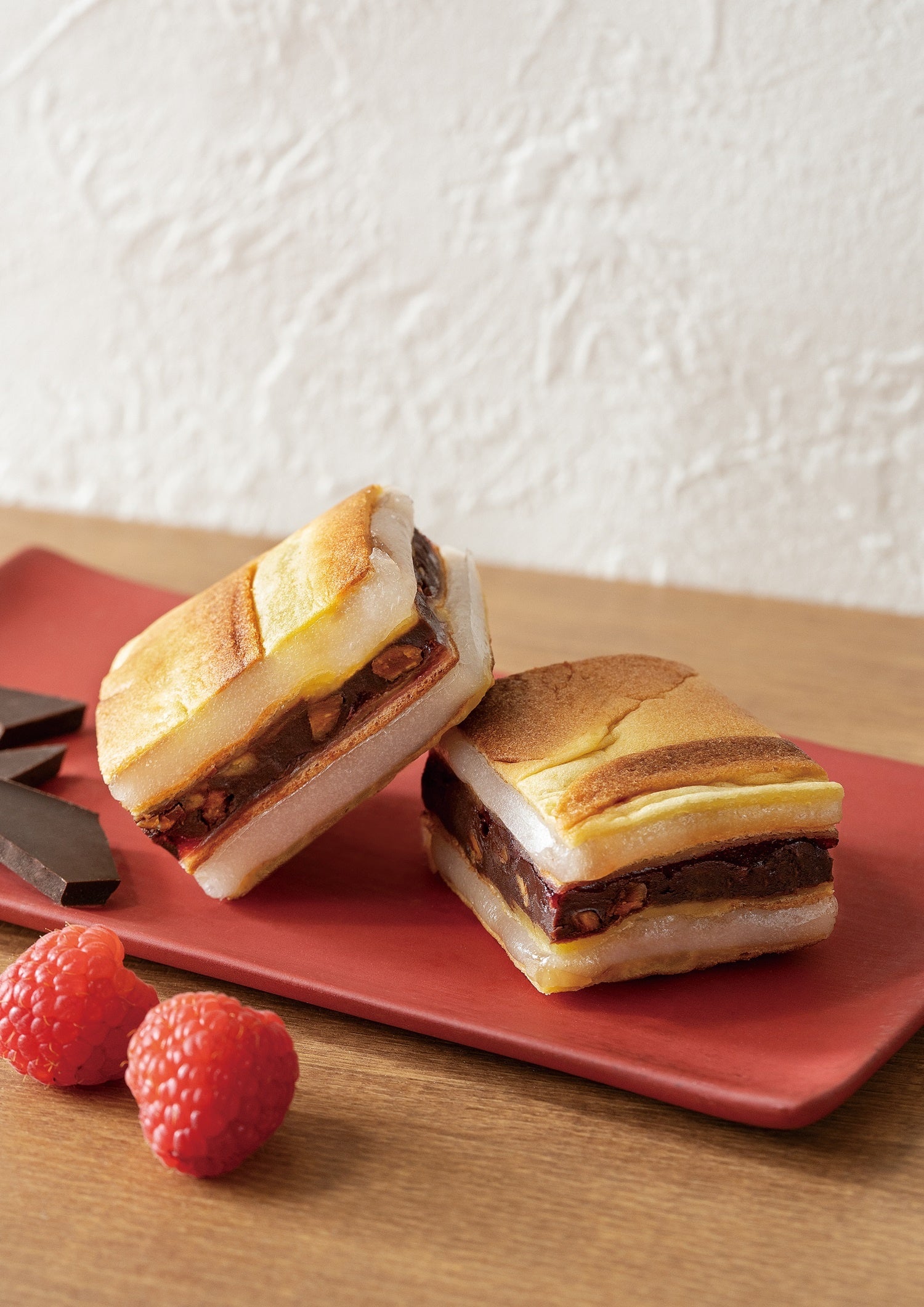 ベルギー産のカカオ分72%のダークチョコレートガナッシュとフランボワーズジャムを、もっちり食感の羽二重餅で挟み、シュー生地でサンドしました。伝統的な福井県勝山名菓「羽二重くるみ」の和洋折衷な味わいに、濃厚なチョコレートと甘酸っぱいフランボワーズが加わり、新たな逸品が生まれました。