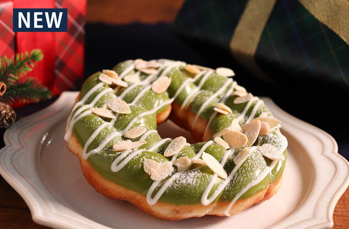 商品特徴:ふわふわ&もちもちのドーナツ生地をリースに見立てて飾り付けました。粉雪を思わせる粉糖で気分はホワイトクリスマス!