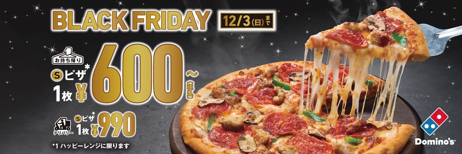 ドミノ・ピザのブラックフライデーセールは11月24日(金)から! Sサイズ・1ハッピーレンジの6種類が、お持ち帰り600円から!デリバリーでも990円から!