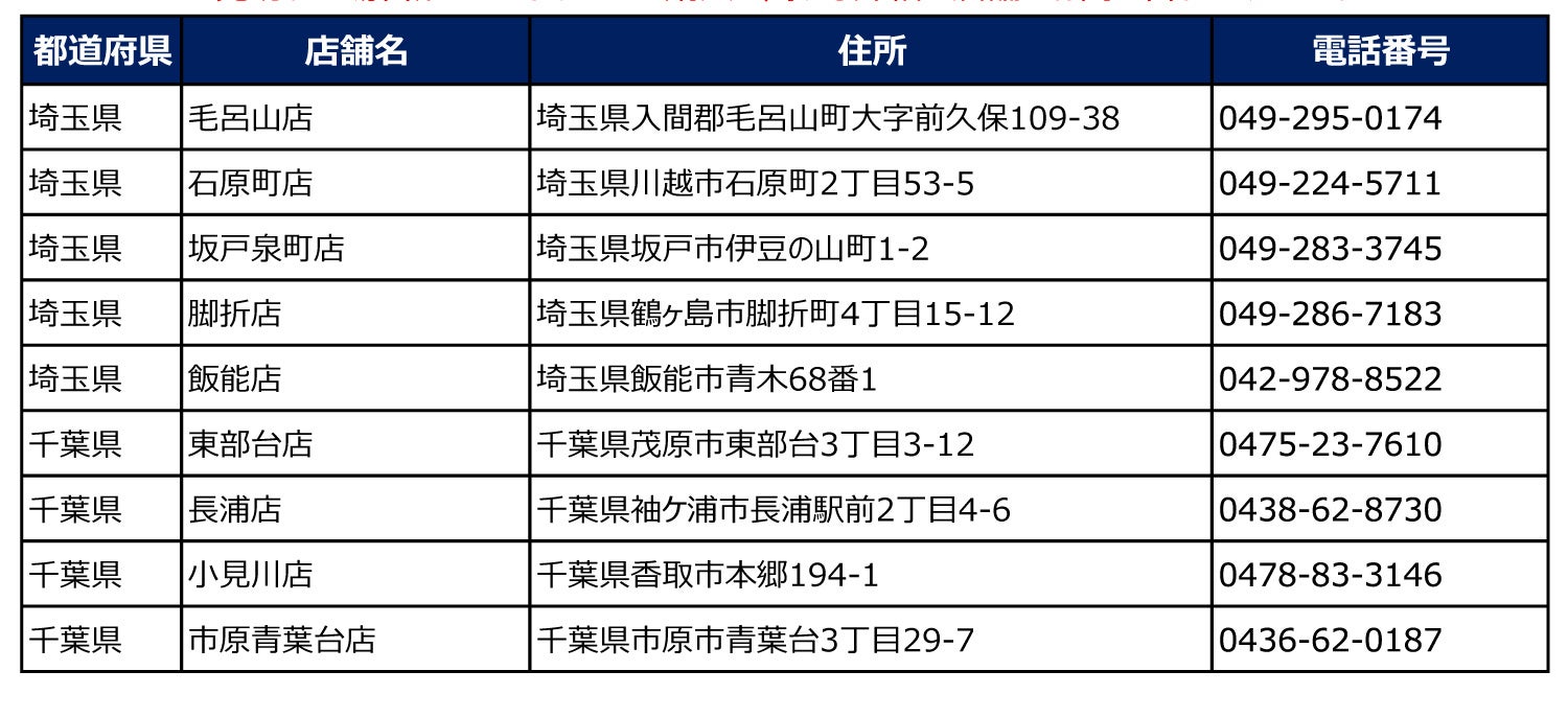 ◆実施店舗:毛呂山店/石原町店/坂戸泉町店/脚折店/飯能店/東部台店/長浦店/小見川店/市原青葉台店
