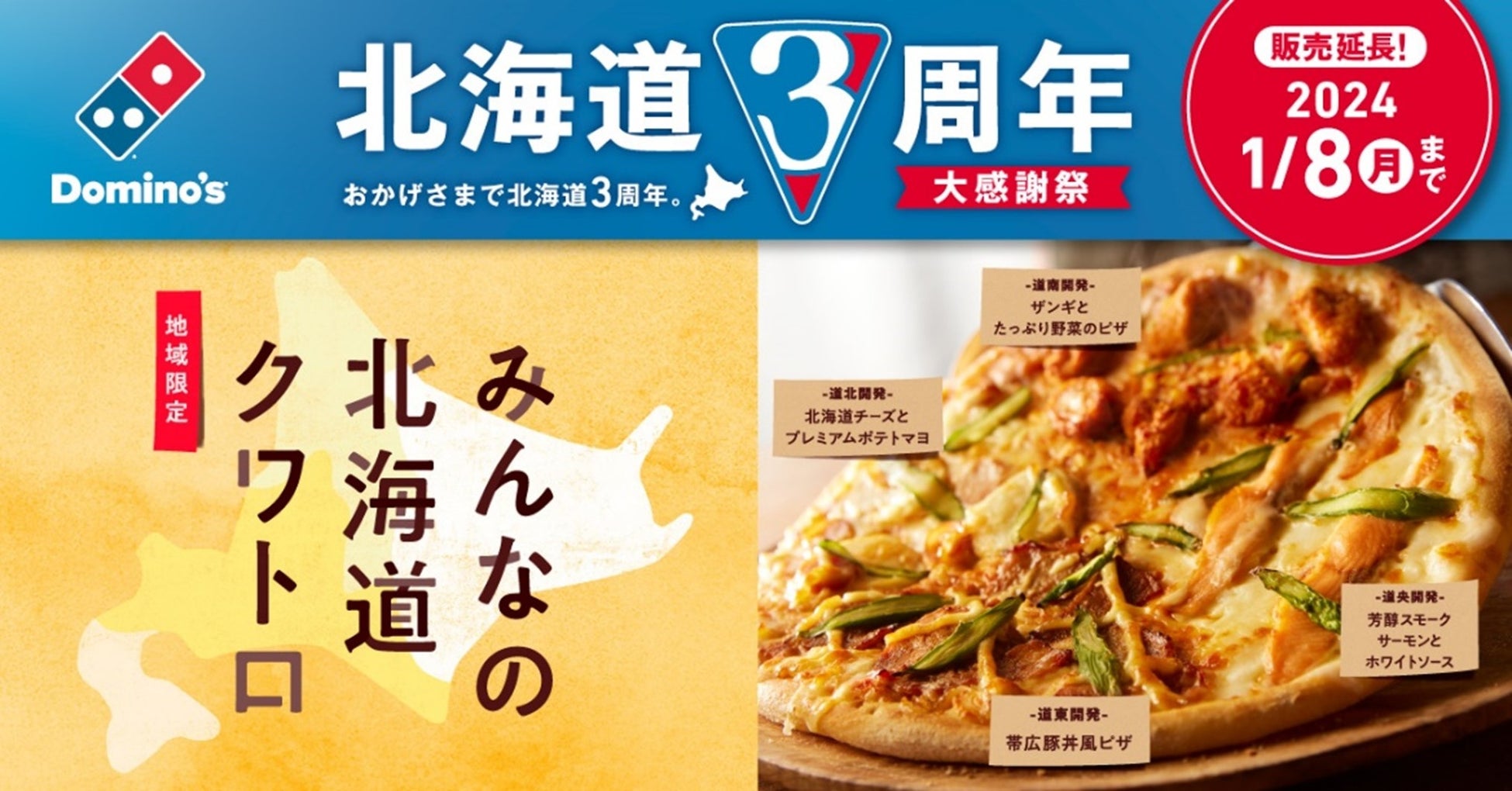 ドミノ・ピザは、2020年11月27日に北海道へ再出店を果たし、本年で北海道再出店3周年を迎えます。昨年2022年より、3周年を目指した「北海道3周年キャンペーン」を、北海道限定で1年に渡りロングラン実施しており、おかげ様で、2023年11月27日(月)に無事3周年を迎える運びとなりました。「北海道3周年キャンペーン第8弾」として、「北海道3周年大感謝祭」を2024年1月8日(月)まで開催します。