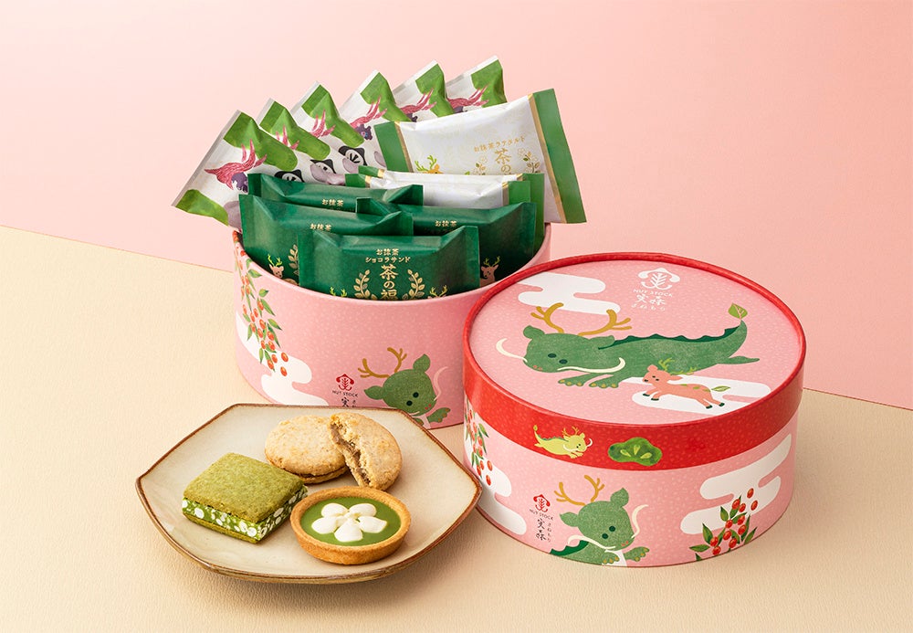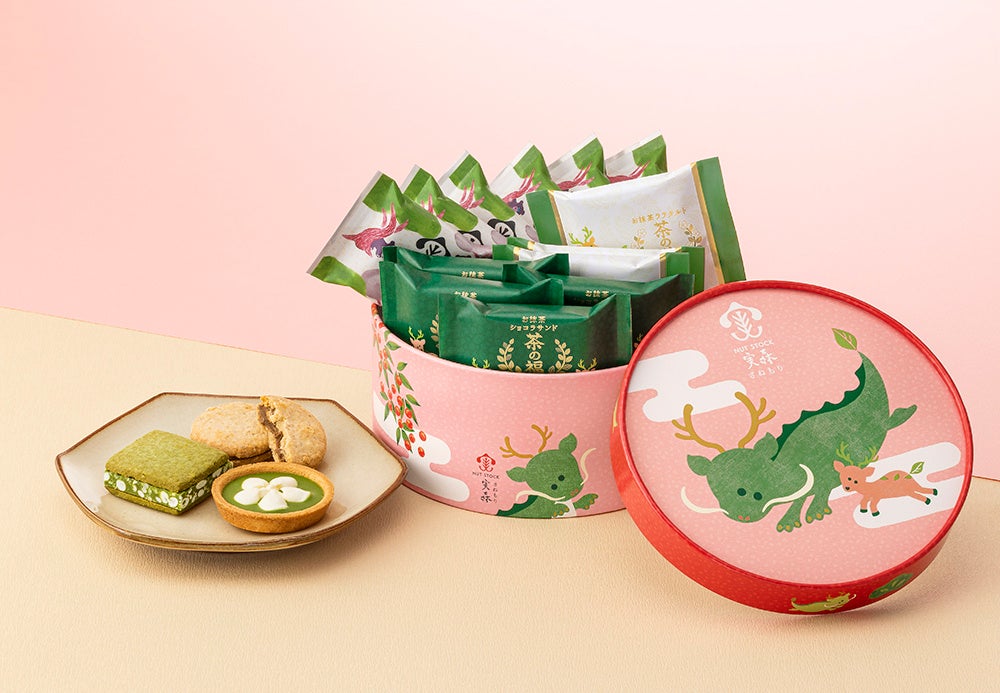 和と洋の素材・技法を自在にとりいれ、“一歩先のおいしさ”を提供する「ナッツストック 実森(さねもり)」から、新年の縁起を祝う『たつどし福箱』が登場です。実りの森に幸運をもたらす“たつ”が新年のご挨拶。実りの森に舞い降りた“たつ”や実森のブランドシンボル“しか”が描かれた紅白カラーのボックスには、森の恵み、茶の緑、米の恵みをスイーツに吹き込んだ今時な和菓子を詰め合わせました。昇り龍のように飛躍の年になりますようにと願いを込めたスイーツボックスです。