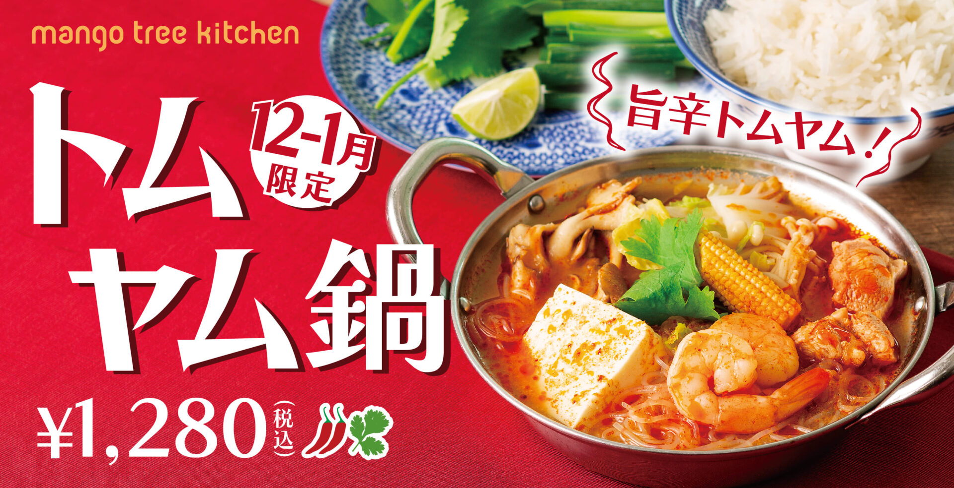 タイの代表的なスープで「甘・辛・酸」のバランスが絶妙な「トムヤムクン」、小鍋に具材とスープを入れてコトコト温めた鍋料理を、駅チカ・駅ナカで展開するタイ料理のクイックなファストフード「マンゴツリーキッチン」で、お1人様でも気軽にお召し上がりいただけます。