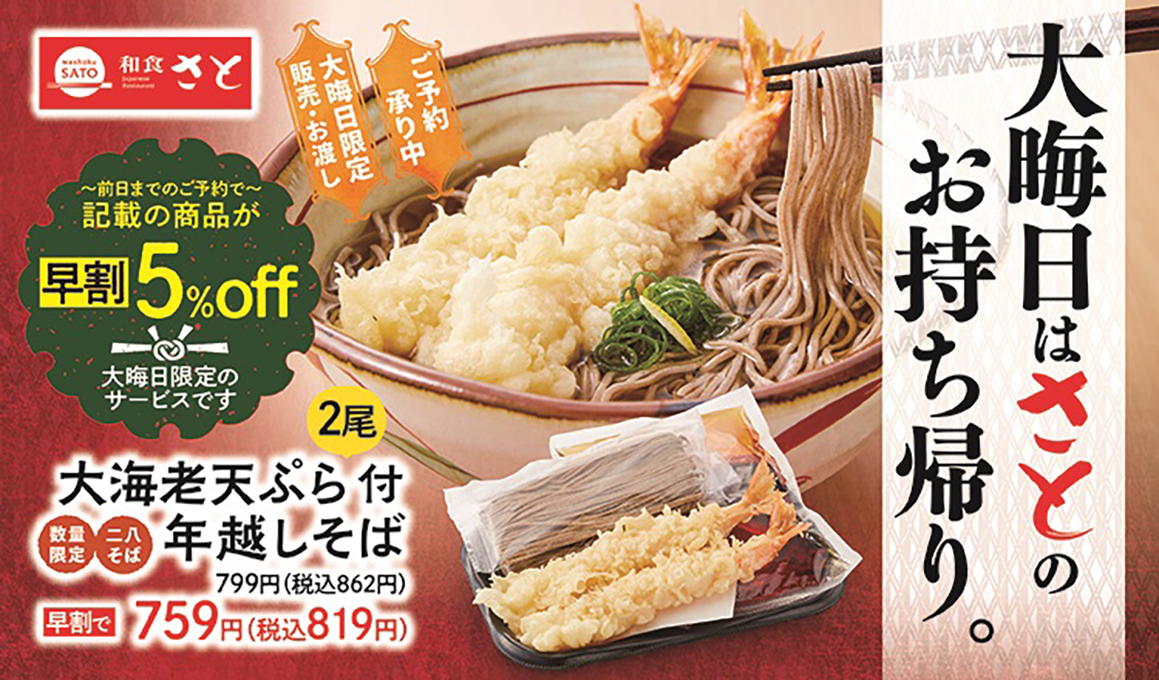 国内197店舗を展開する「和食さと」では、12月31日(日)大晦日に受渡し/販売するお持ち帰り専用の「年越しそば」を、数量限定で今年も販売します。
