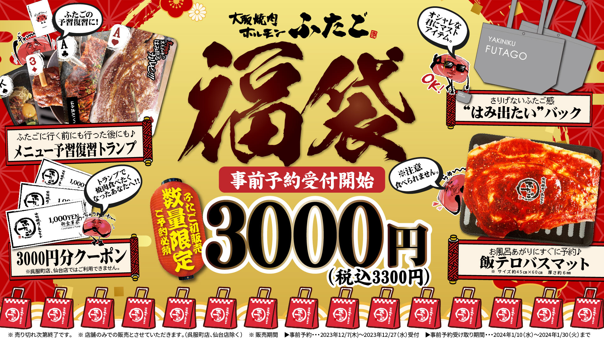 株式会社FTG Company(本社:東京都目黒区、代表取締役社長:李 純哲)が運営する「大阪焼肉・ホルモン ふたご」(以下「焼肉ふたご」)は、焼肉ふたご初の福袋予約販売を開始します!F-POINTアプリのお食事クーポンやオリジナルグッズが入ったお得な福袋は国内店舗(一部店舗除く)にて2023年12月7日(木)から数量限定で予約受付をスタートします。