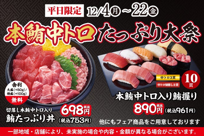平日限定企画!12/4(月)~「本鮪中トロたっぷり大祭」開催!豪華ネタ本鮪中トロをたっぷり使用した特別なメニューをご用意しました!!この機会に小僧寿しへ!