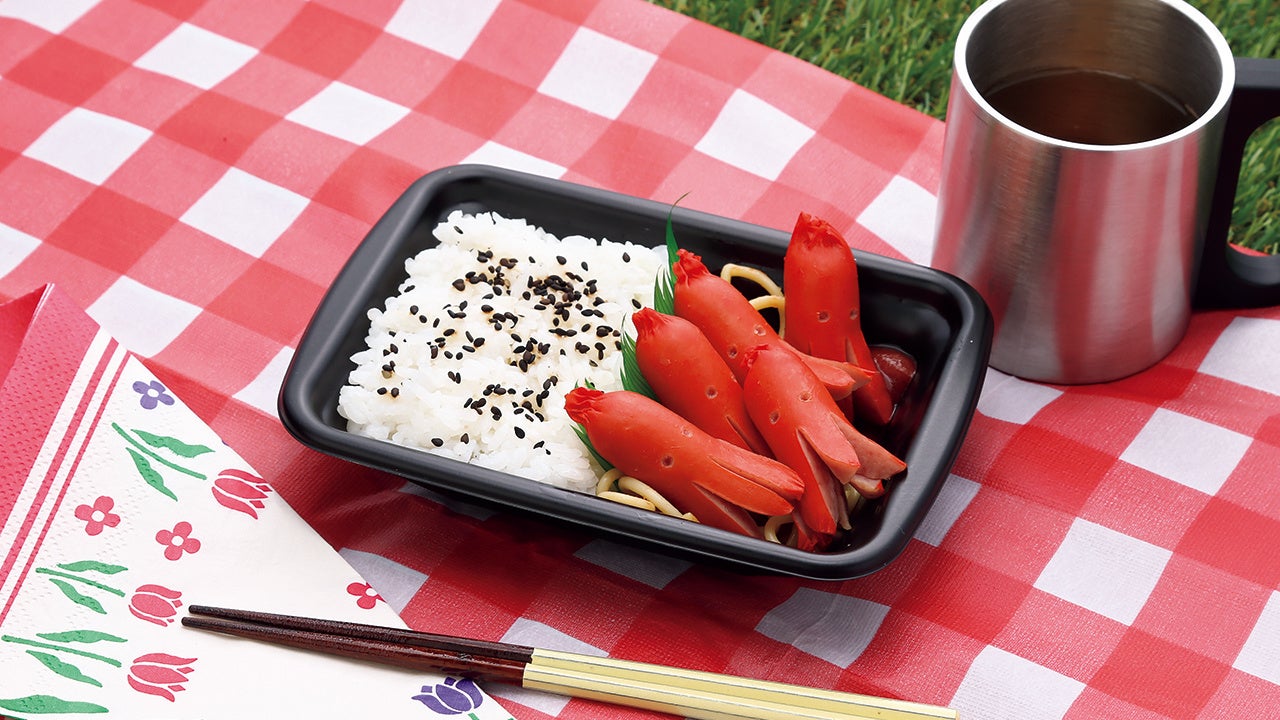 お弁当に入っていると嬉しい気持ちになる「タコさんウィンナー」を5個盛り付けました。ウィンナーにはタコさんの顔がついており、レンジであたためるとタコさんの足がふわっと広がる、楽しくてかわいいお弁当です。