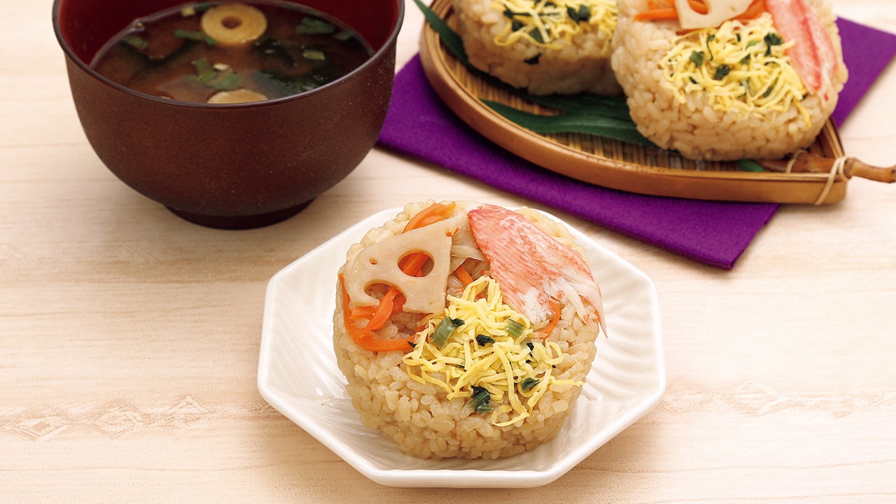 茶飯にカニカマ、煮物(レンコン・ごぼう・人参)、野沢菜、錦糸玉子をトッピングした、どこから食べても様々な具材が楽しめる彩り豊かなおにぎりです。