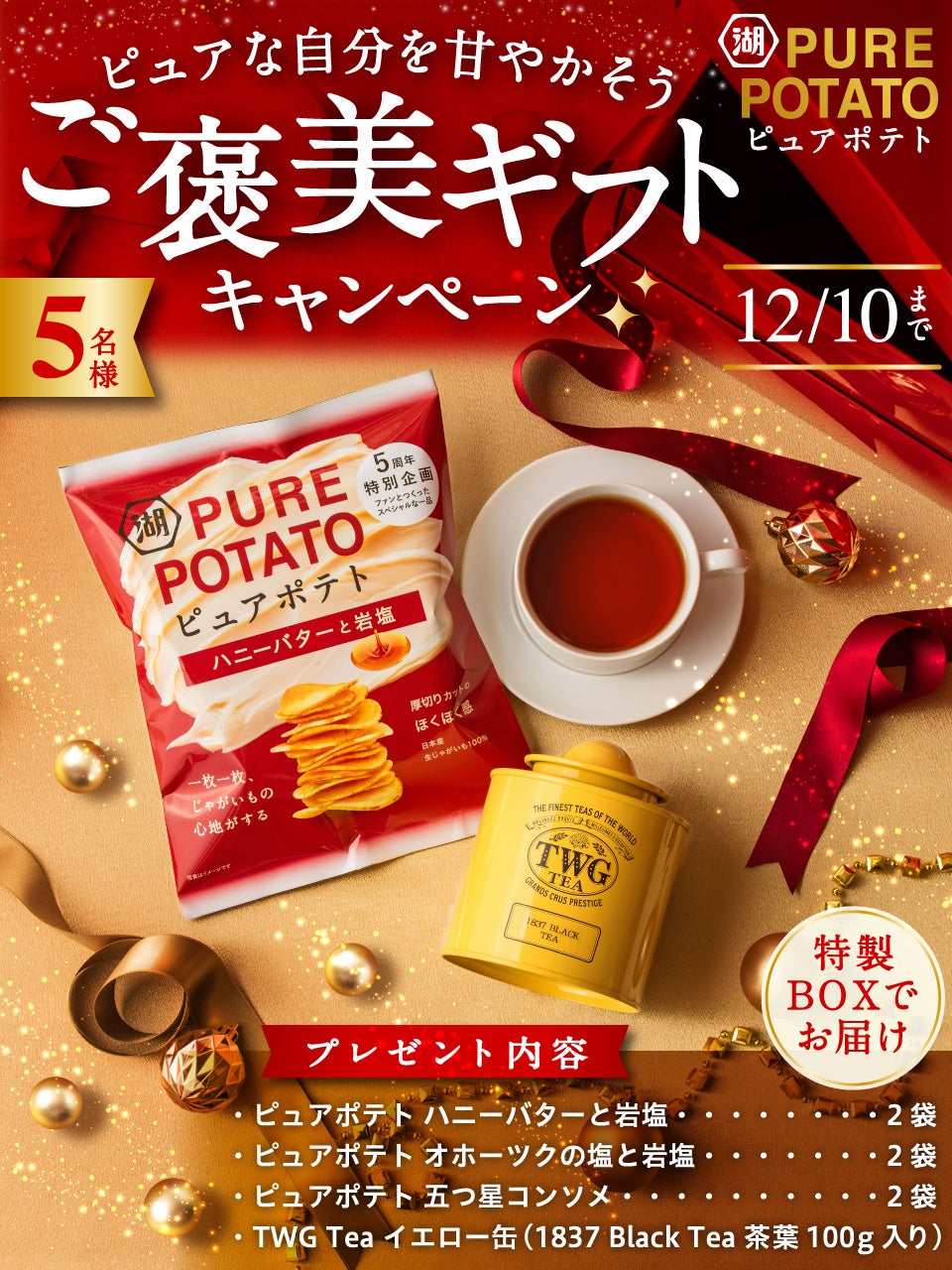 ご褒美やリラックスタイムにぴったりな新商品「ピュアポテト ハニーバターと岩塩」の発売を記念し、『ピュアポテト』3品とシンガポールで創業した高級ティーブランド「TWG Tea」の代表的なお茶『1837 Black Tea』を特製ギフトBOXに入れて、抽選で5名様にプレゼントするキャンペーンを実施します。湖池屋 コイケヤ【公式】(@koikeya_cp)をフォローいただき、「#ピュアポテト」をつけてあなたのリラックスタイムを引用リポストで投稿していただくと応募完了です。ご褒美ギフトを当てて、素敵なリラックスタイムをお過ごしください。