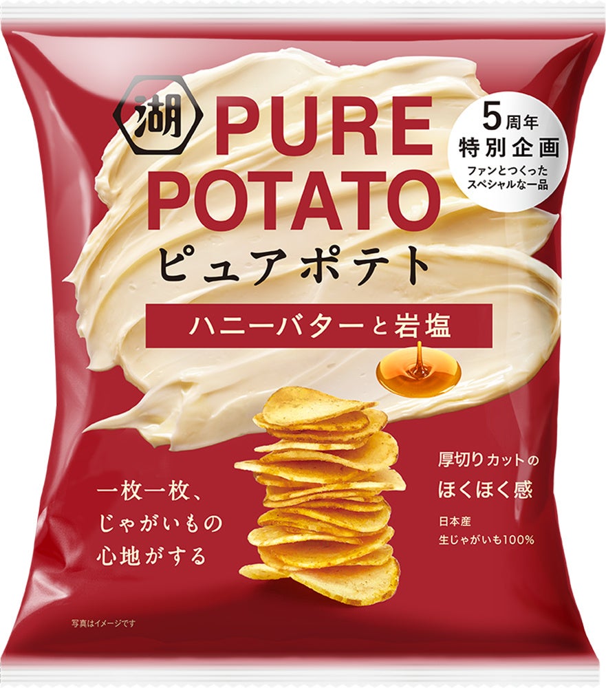 今回発売する「ピュアポテト ハニーバターと岩塩」は、今年3月に湖池屋公式Twitter(現X)で実施されたブランド5周年企画“みんなで作る特別なピュアポテト(※)”のファン投票で見事1位を獲得した『甘じょっぱい味わい』をテーマに誕生した一品。毎年ご好評をいただいている冬の定番バター味に、ファンのみなさまからの声を参考にアレンジを加え、「ピュアポテト」ならではのちょっと贅沢でご褒美にもぴったりな“甘じょっぱ”が完成しました。