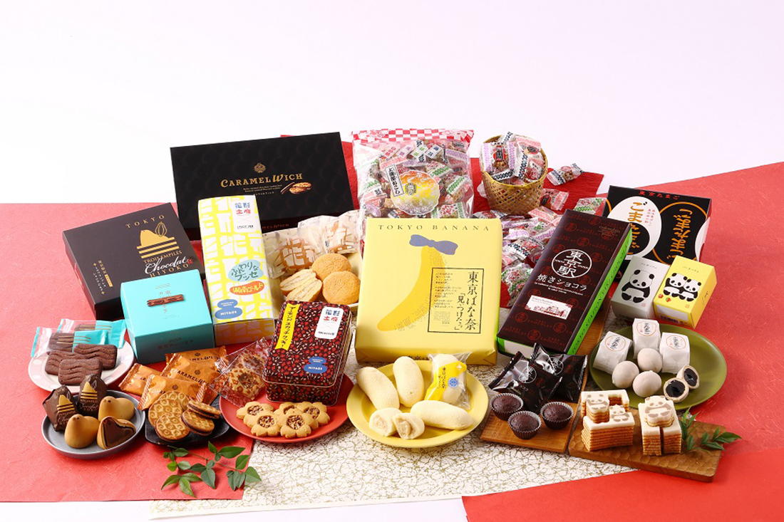 東京ばな奈「見ぃつけたっ」8個入、キャラメルウィッチ 11個入、東京たまご ごまたまご8個入、トロワアンプレス ショコラひよ子6 個入、東京駅焼きショコラ 5個入、東京カンパネラ ショコラ5個入、カタヌキヤ こどもパンダバウム 1個、カタヌキヤ パンダバウム 1個、常盤堂 雷おこし上磯部4種ミックス、花形土産xモロゾフ アーモンドスカッチクッキー 7枚入、花形土産xたこ満 ふんわりなブッセ 5個入
