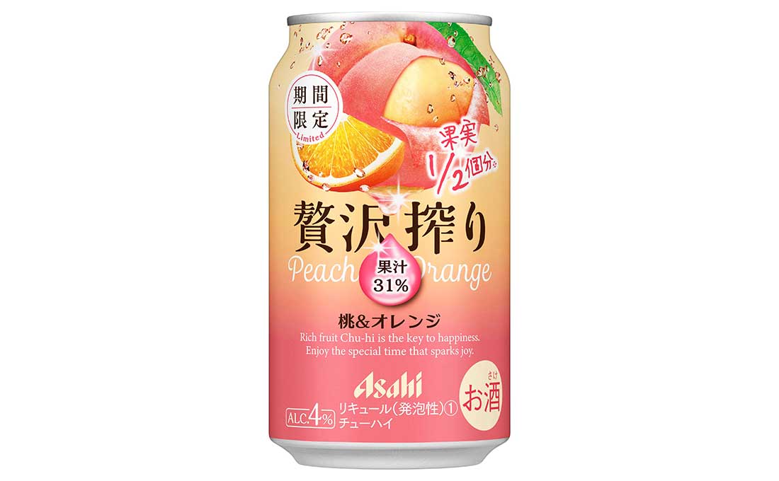 『アサヒ贅沢搾り期間限定桃&オレンジ』は、桃1/2個分※2にあたる果汁31%を使用しています。オレンジリキュールを加えることで、桃の芳醇な甘みとオレンジの酸味が混ざり合ったバランスの良い味わいが楽しめます。パッケージは、桃とオレンジのイラストを大きく描くとともに、ピンクとオレンジのグラデーションの背景で味わいの特長を表現しています。