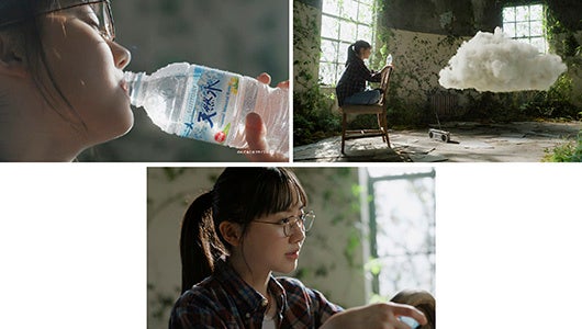 芦田さんが秘密基地で「サントリー天然水」を飲んでいると、ラジカセから“雲”が話しかけてきます。「その天然水って、どうやってできたか知ってた?」という質問に、「いや、考えたことなかった」と答える芦田さん。「やっぱり…」と言いながら“雲”は彼女の目の前で「山に降った雨や雪を、森が20年かけて天然水にしてくれたんだよ」と、その様子を実際に示してみせます。「おぉ!自然のおかげじゃん!」と興味津々の芦田さん。「それそれ!」と答えた“雲”に、「じゃあ、私たちからも大自然におかえししないとね」と呼びかけます。