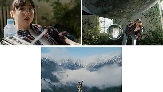 雄大な山脈に向かって、芦田さんが右手で高らかにピースサインをするカットは、日の出とともに撮影が行われました。ロケ地は当初、霧に覆われ、雨も降るとの予報ながら、日の出から1時間ほど経つと、ほんの一瞬だけ雲が晴れて、その間から山脈が見える絶好のチャンスが到来。いつ始まっても対応できるよう、寒空の下でスタンバイしていた制作チームのおかげで、何とか一度だけ撮影することができました。その後、再び天候が良くなるタイミングを狙って、しばらく待機したものの、結局チャンスは訪れることなく、その一回が奇跡のワンカットとなりました。