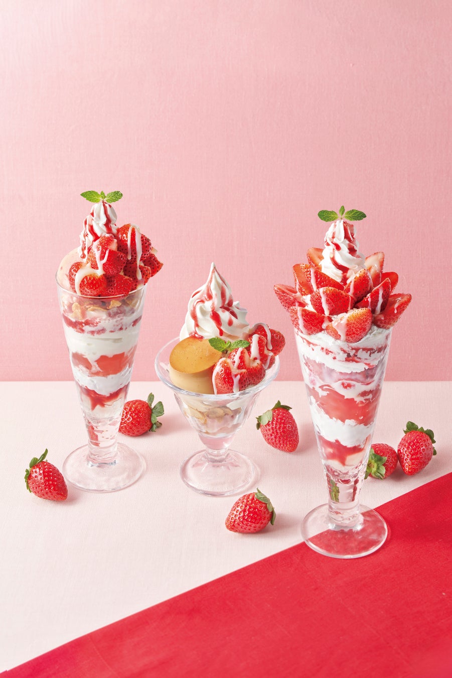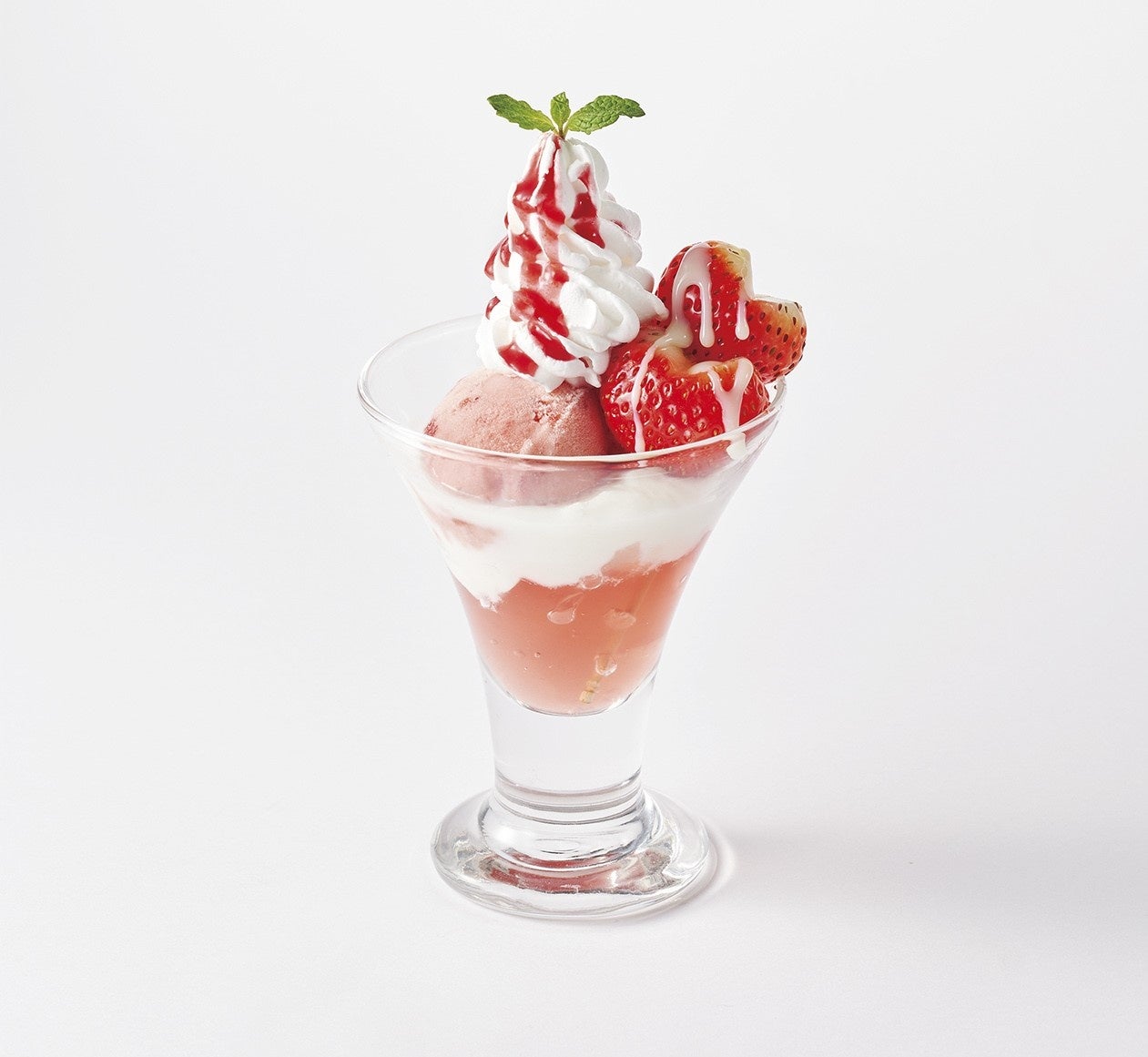 ゼリーにソルベ、フレッシュな国産いちごなど、色々ないちごが楽しめます。練乳のミルキーな味わいと、コーンフレークのサクサク食感がアクセントになっています。