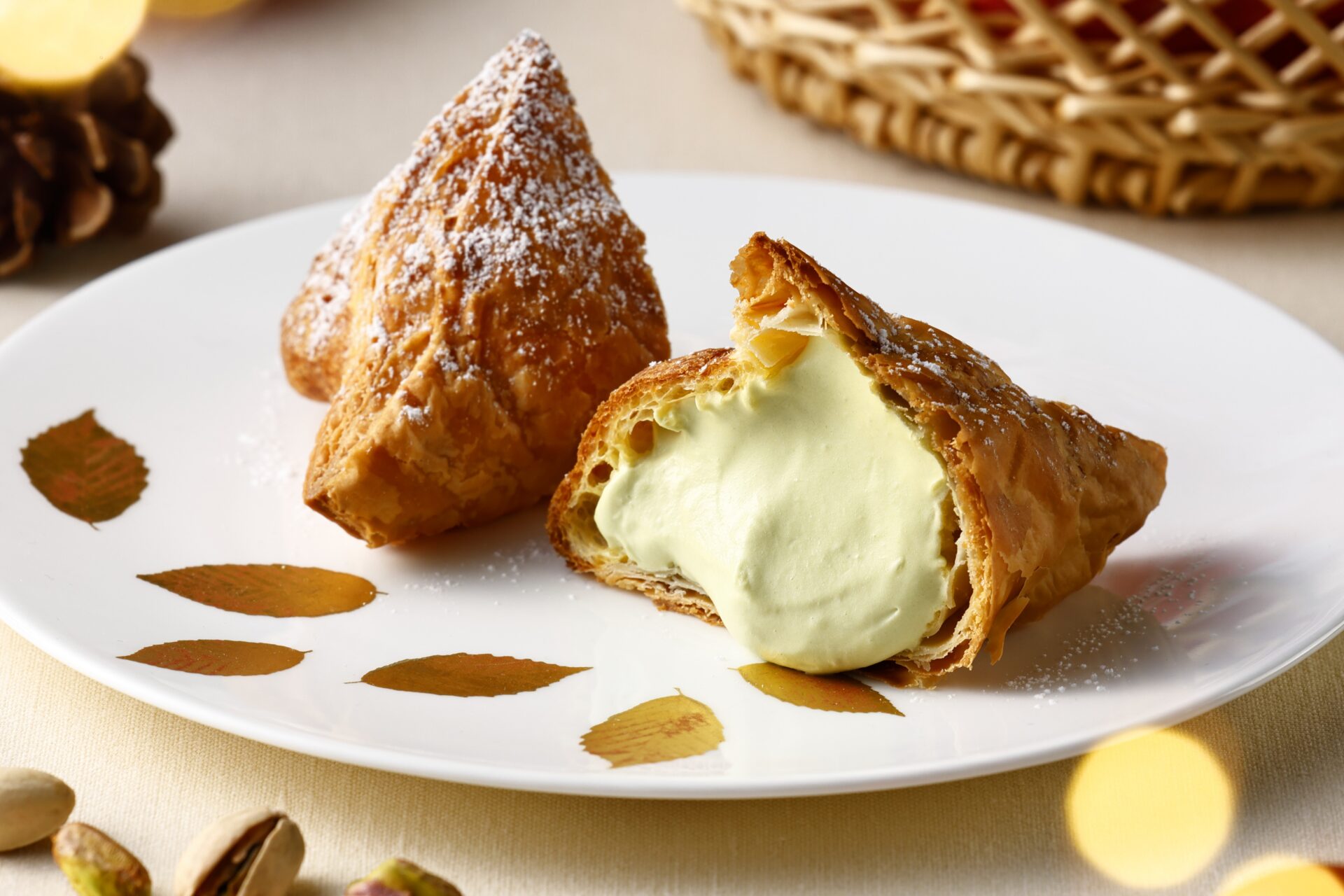 オーブンで焼き上げたサックサクのパイに濃厚で風味豊かなピスタチオクリームを詰めました。北海道でつくられた生クリームとマスカルポーネの優しい甘さとピスタチオのコクが絶妙にマッチした期間限定フレーバーです。