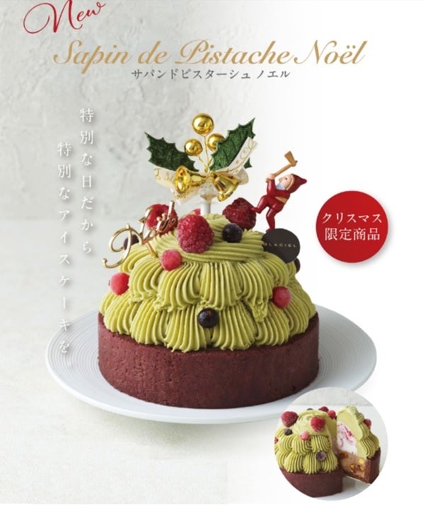 そして、そのグラッシェルより、今年も新作のクリスマス・アイスケーキが登場。クリスマスツリーに見立てた、ピスタチオの味わいが広がるアイスケーキ「サパンドピスターシュノエル」は、見た目も華やかな一品。