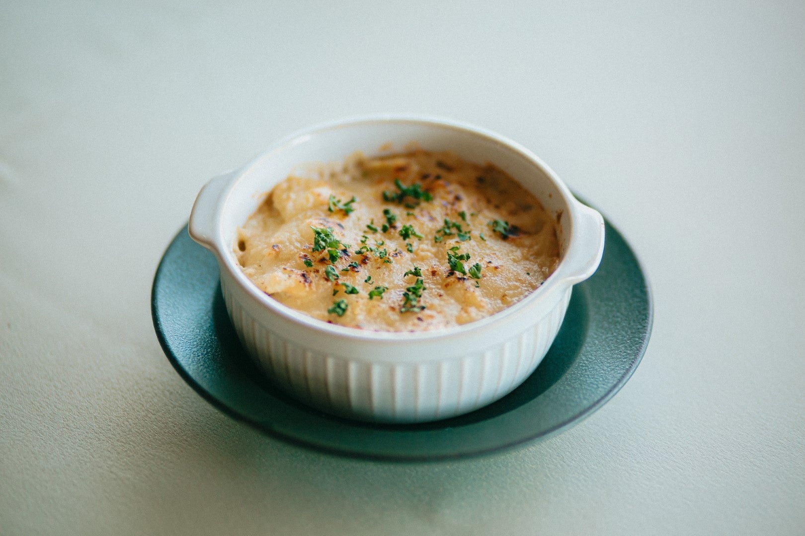 濃厚でクリーミーなアンチョビ風味のソースが、じんわりとポテトにしみこみ、一口ごとに広がる深い味わいがたまりません。トッピングされたキャラメリゼされた玉ねぎが、華やかさをプラスし、お皿をクリスマスの特別な食卓に変えます。