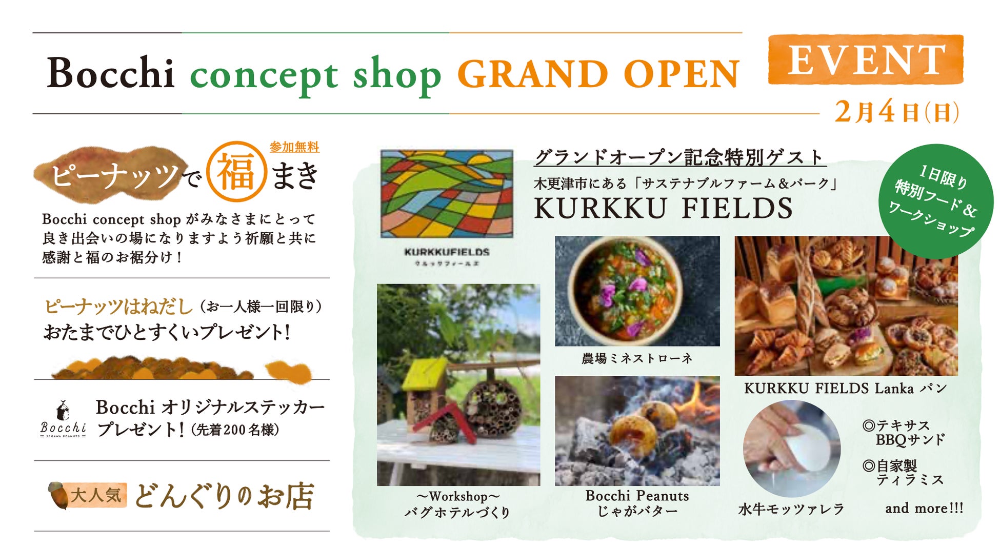 オープンに伴い、同日に千葉県木更津市にある「サステナブルファーム&パーク」KURKKU FIELDS(クルックフィールズ)による特別なフード&ワークショップを実施します。更にEarth Friendly 〜未来の子供につなぐ〜「千葉の落花生をもっと楽しく、おいしく」 のコンセプトで毎月開催しているBocchiツキ市も同時開催。この日ならではの特別な体験をご用意します。下記概要をご確認いただき、ぜひご取材検討いただけましたら幸いです。