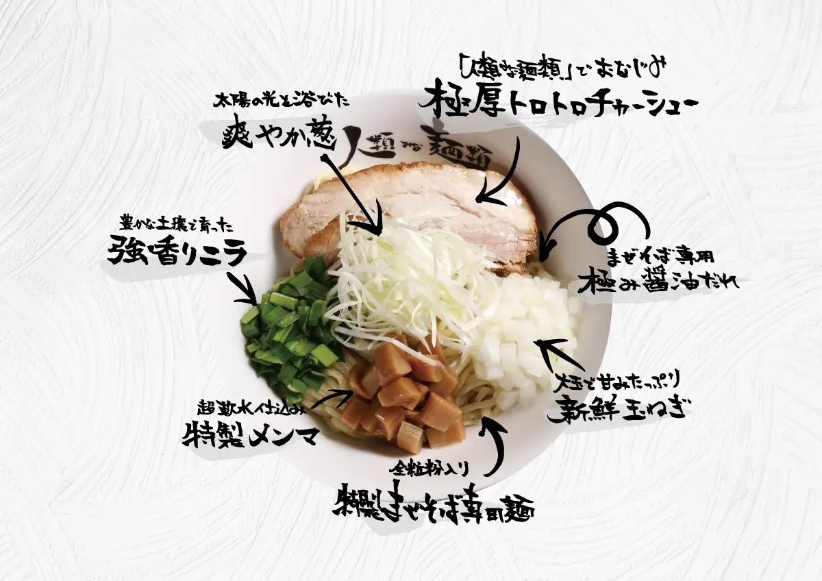 看板商品の「人類みなまぜそば」は、人類みな麺類でお馴染みの極厚トロトロチャーシューと、まぜそば専用に開発した醤油のカエシ、そしてこちらも専用の全粒粉入り特製麺が絡み合う一杯となっております。