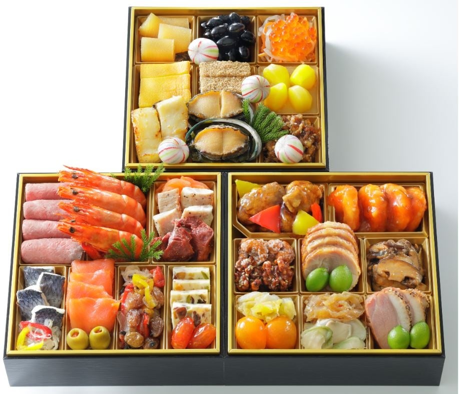 【内容】多彩な味わいの和洋中三段重に、鮑や和牛ローストビーフ、愛知みかわ豚の黒酢酢豚などプレミアム食材をふんだんに盛り込みました。