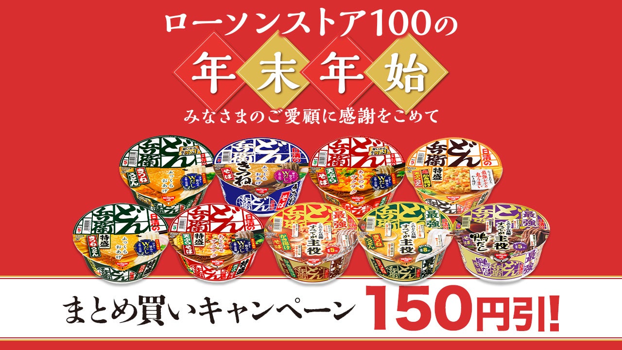 対象期間中、日清のどん兵衛各種を3個まとめてご購入いただくと税込価格より150円お値引きします。3個購入ごとに150円引きとなりますので、年越しそばやうどん、また年始のお供にまとめ買いのチャンスです。