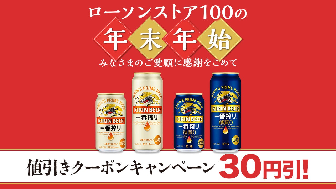 対象期間中、ビール類(ビール・発泡酒・新ジャンル)をご購入いただきますと、抽選で3万名様に次回キリン一番搾り各種に使える30円引クーポンを差し上げます。