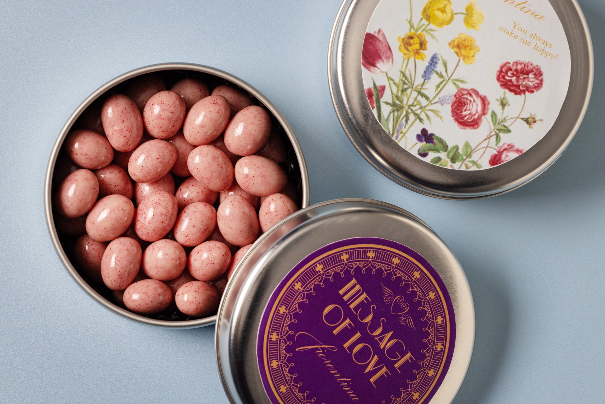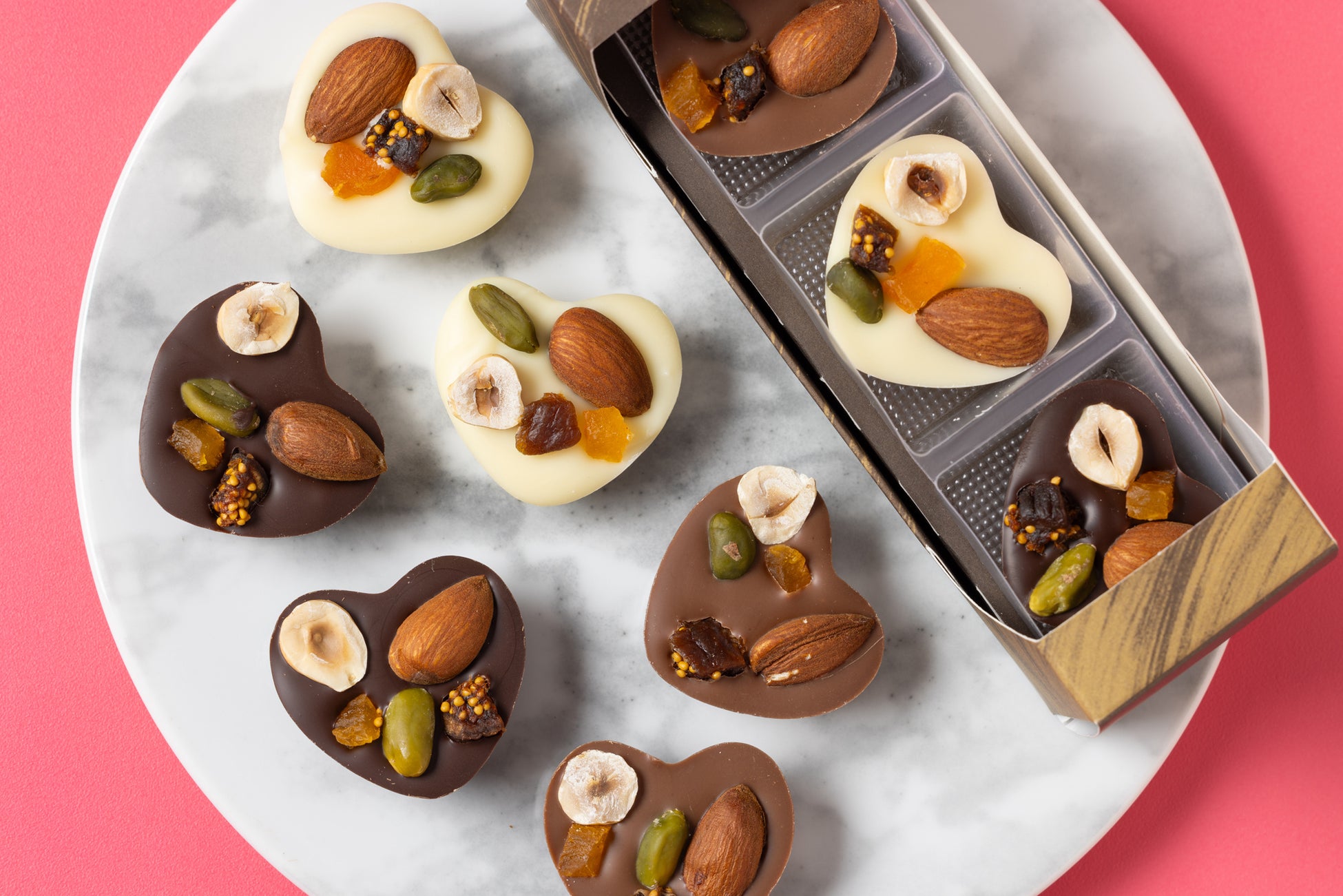 イチジク、アプリコット、アーモンド、ヘーゼルナッツ、ピスタチオをトッピングした、ミルク、スイート、ホワイト、3つのテイストのハート型チョコレート。口当たりまろやかなチョコレートの甘みとともに、ドライフルーツのフルーティーな味わいや香ばしいナッツのザクザクとした食感をお楽しみください。