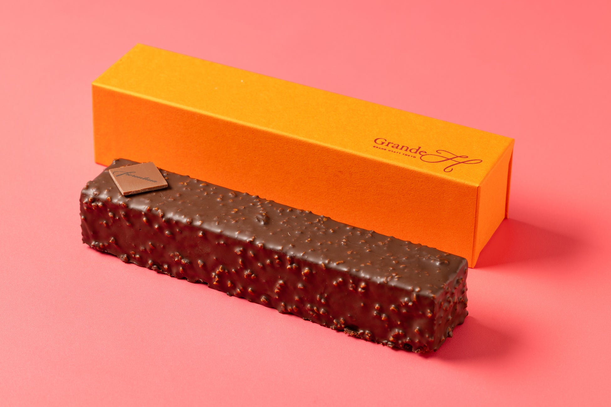 グランド ハイアット 東京のペストリー料理長の金子浩(かねこ ひろし)が、1842年創業の仏「カカオバリー®」へ赴き、オリジナルチョコレートを制作。流通量が少ない希少なタンザニア産カカオとその起源と言われるメキシコ産カカオを組み合わせ、カカオ約70%に仕上げました。タンザニア産は複雑なナッツ感と爽やかなフルーティーさが特徴。さらにメキシコ産は力強いカカオ感があり、リコリス(天草)の香りの広がりの中にスパイシーさとウッディさを感じられます。酸味とカカオの強い苦みが程よく組み合わさり、濃厚で力強いカカオ感とスパイシーさやウッディさなどのアロマを感じていただけます。さらに香ばしさと深みのある甘さが最高のハーモニーを奏でます。「Grande H」と名付けたこのチョコレートはホテルの名前のイタリア語である「Grande(グランデ)」とハイアットと金子の名前の頭文字である「H」に由来しています。
