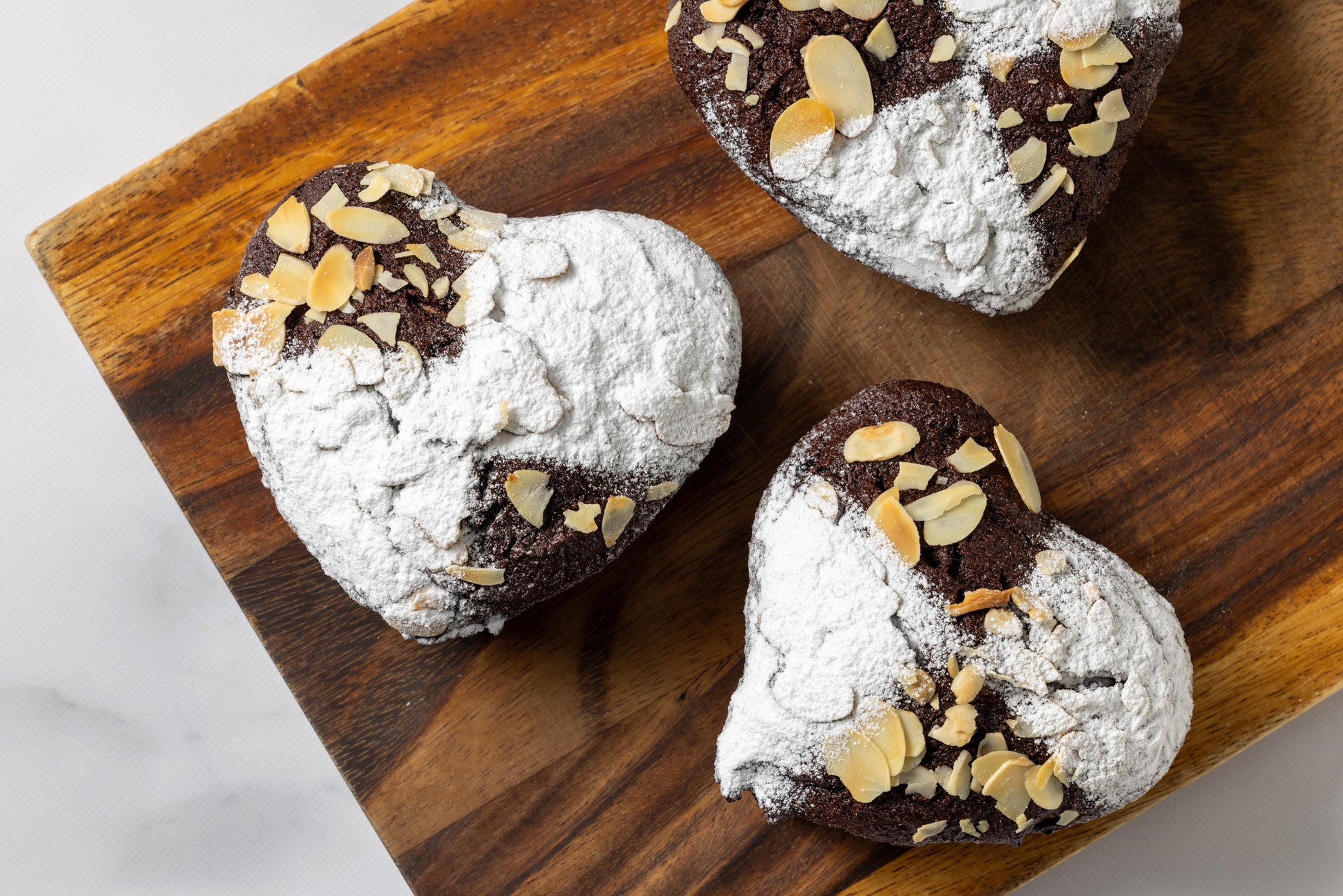 ハート型に仕上げる可愛らしいバレンタインデー限定のブレッドです。ブレッド上部にはクッキー生地をつかっており、メロンパンのようなサクサク感と中のしっとりとしたの食感の違いをお楽しみいただけます。マルサラワインに漬けたレーズン、オレンジ、クルミ、チョコレートチップを中に入れることで、大人な味わいに仕上げました。赤ワインのお供にもおすすめです。