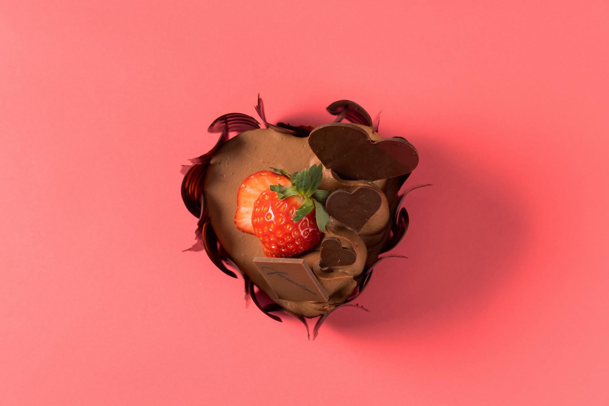 通常よりもさらに上質な食材でつくるグランド プレミアム ショートケーキを、ホワイトデー特別仕様のハート型でご用意いたします。いちご、ラズベリー、ブルーベリーを砂糖でマリネしたホテル自家製のシロップを染み込ませたスポンジに、タヒチ産バニラを使用したクレームブリュレやジャージー乳の生クリーム、いちごをサンド。「フィオレンティーナ ペストリーブティック」のシグネチャーケーキであるストロベリーショートケーキを、さらにワンランク上へと昇華させました。ふわふわのクリームにのせた3枚のハートチョコレートや、1枚ずつ手づくりしている繊細な羽根チョコレートの淡いピンクの色合いが特徴です。
