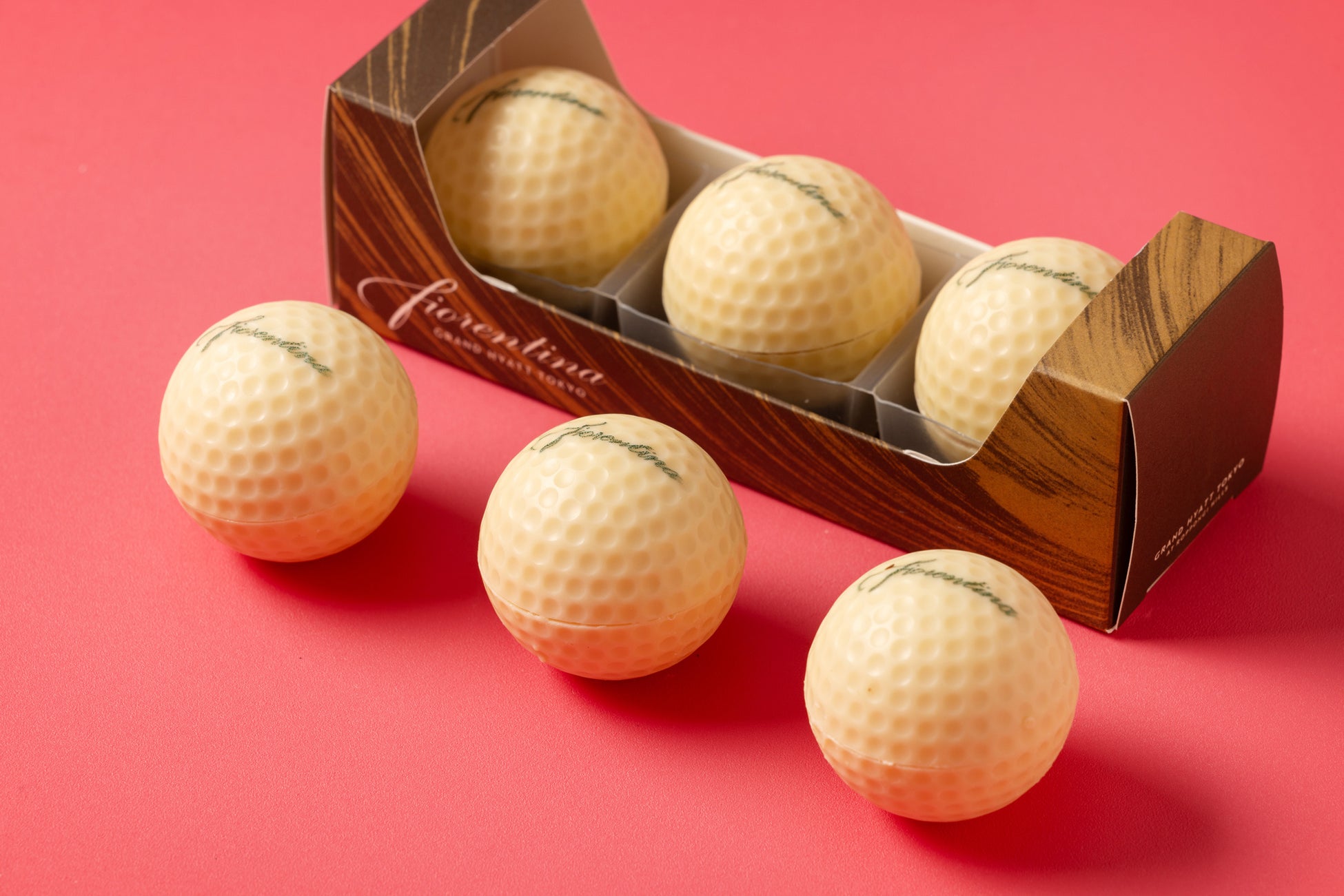 パティシエの遊び心が詰まったユニークなゴルフボール型のショコラ。フィオレンティーナのロゴを入れたホワイトチョコレートを割ると、同じくホワイトチョコレートでコーティングしたカリカリ食感のライスパフが詰まっています。ゴルフ好きにはたまらない一品です。