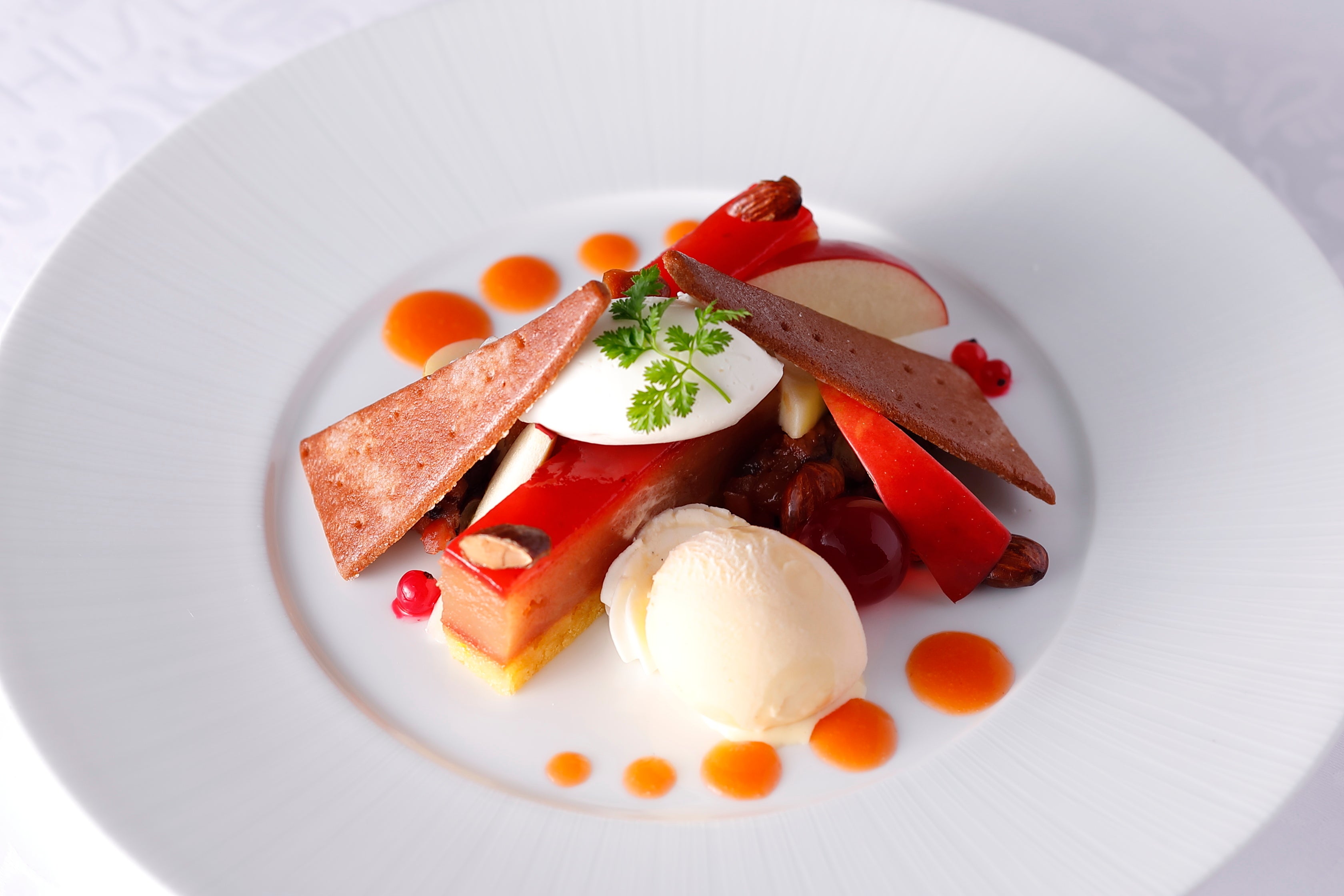 “紅玉”の特長である爽やかな酸味と、タルトタタンの甘さが織り成すマリアージュが魅力のひと皿です。