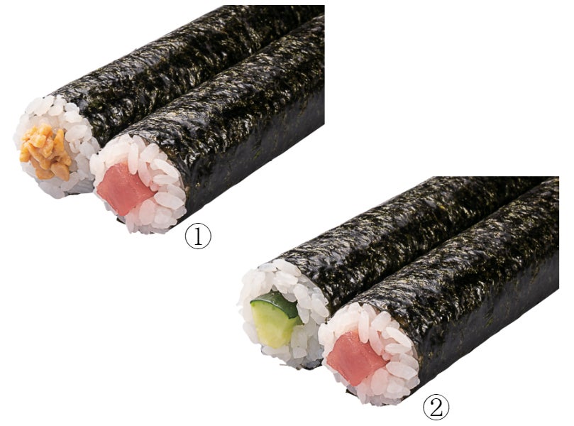 かっぱ寿司の恵方巻の定番である『特選恵方巻』と定番メニューの細巻より鉄火巻とかっぱ巻、なっとう巻を組み合わせたお得なセットです。細巻はおこさまでも頬張ることができるサイズのため、ご家族皆さまでお楽しみいただけます。