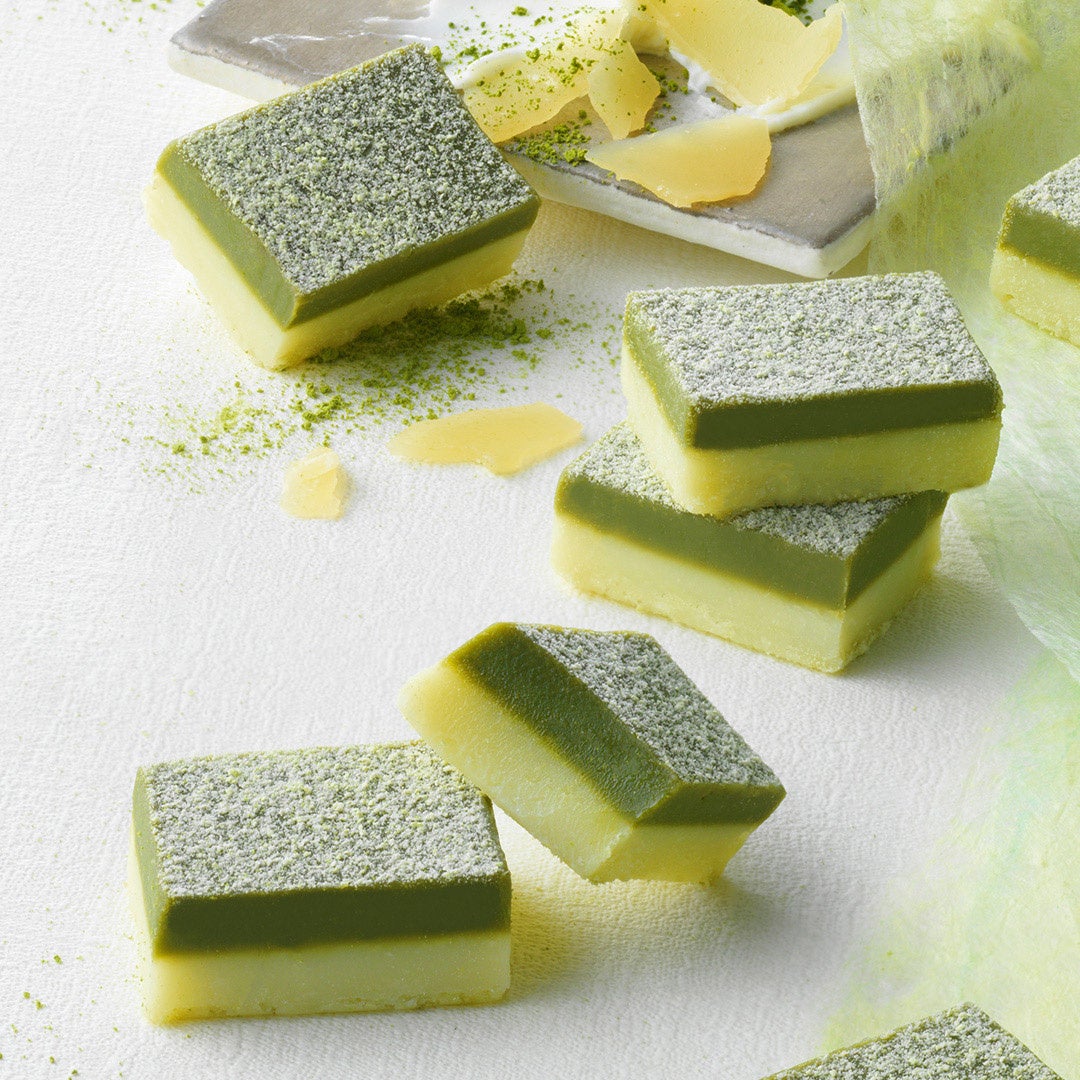 京都産宇治抹茶をブレンドしたホワイトチョコレートと、北海道産の3種のチーズ(マスカルポーネ、ゴーダ、クリームチーズ)を使用したホワイトチョコレートを2層に重ね、宇治抹茶を使用したチョコレートのパウダーをかけました。