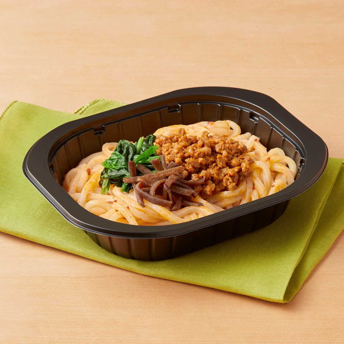 まずは『米粉麺でつくった汁なし担々麺』から試食してみました。トレー入りなので、そのまま温めて食べられるのが簡単手軽で良いですね。